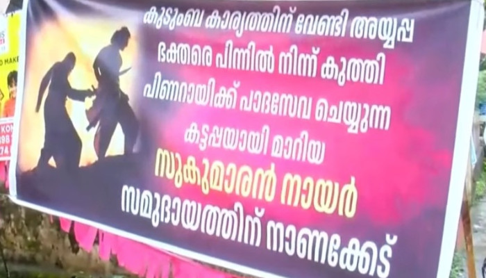 എന്എസ്എസ് ജനറല് സെക്രട്ടറി സമുദായത്തിന് നാണക്കേടാണെന്നും കുടുംബകാര്യത്തിന് വേണ്ടി അയ്യപ്പഭക്തരെ പിന്നില് നിന്ന് കുത്തിയെന്നുമായിരുന്നു പോസ്റ്ററിൽ. ആഗോള അയ്യപ്പ സംഗമത്തിന് പ്രതിനിധിയെ അയച്ച് എന്എസ്എസ് പിന്തുണ നല്കിയിരുന്നു. ഇതിന് പിന്നാലെയാണ് ശബരിമല വിഷയത്തില് എല്ഡിഎഫിനൊപ്പം ആണെന്ന് എന്എസ്എസ് ജനറല് സെക്രട്ടറി പറഞ്ഞത്. എന്നാൽ സുകുമാരൻ നായർക്കെതിരായ നീക്കങ്ങൾക്ക് പിന്നിൽ കോൺഗ്രസ് അനുകൂലികളായ കരയോഗ അംഗങ്ങൾ ആണെന്നാണ് സൂചന.