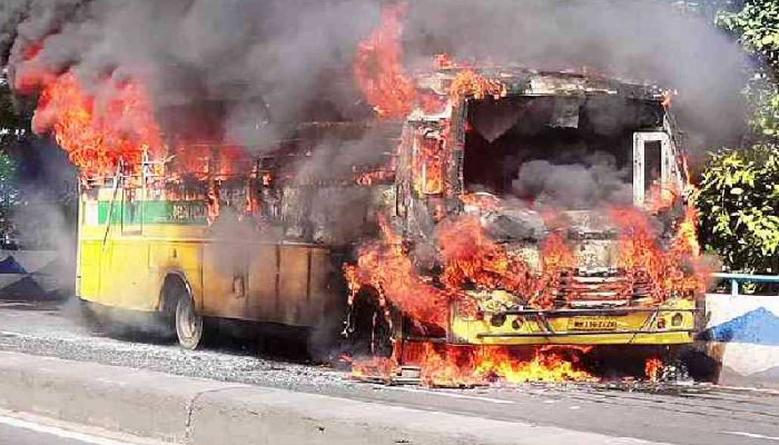 ബെംഗളൂരു-ഹൈദരാബാദ് സ്വകാര്യ വോൾവോ ബസിനാണ് കത്തിപിടിച്ചത്. തീപിടിത്തത്തിൽ ബസ് പൂർണമായി കത്തി നശിച്ചു. ബസ് ഇരുചക്രവാഹനത്തിൽ ഇടിച്ചതാണ് അപകടത്തിലേക്ക് നയിച്ചത്. ഇരുചക്രവാഹനം ബസിനു അടിയിൽ കുടുങ്ങിയതോടെ റോഡിൽ ഉരഞ്ഞ് തീപടരുകയായിരുന്നു.