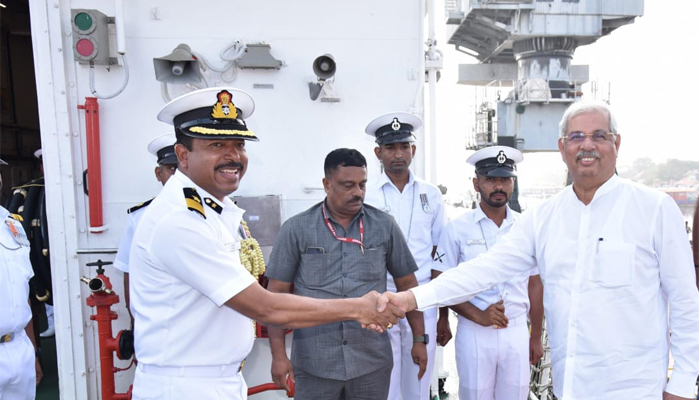 കോസ്റ്റ് ഗാർഡ് കപ്പലായ സമർഥ് — ൽ എത്തിയ ബഹുമാനപ്പെട്ട കേരള ഗവർണർക്ക് ആചാരപരമായ ഗാർഡ് പരേഡ് നൽകി. കോസ്റ്റ്ഗാർഡ് കേരള‑മാഹി കമാൻഡർ,