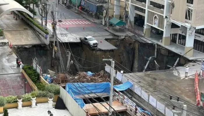 ബാങ്കോക്കിൽ തിരക്കേറിയ റോഡ് പൊടുന്നനെ ഇടിഞ്ഞുതാഴ്ന്ന് ഭീമാകാരമായ ഗര്ത്തം രൂപപ്പെട്ടു. ഡുസിറ്റ് ജില്ലയിലെ സാംസെൻ റോഡാണ് ഇടിഞ്ഞത്. 50 മീറ്റര് ആഴമുള്ള കൂറ്റൻ സിങ്ക് ഹോൾ രൂപപ്പെട്ടത് മൂലം വജിറ ആശുപത്രിക്ക് സമീപമുള്ള പ്രദേശത്തെ ഗതാഗതം തടസ്സപ്പെടുത്തുകയും ആളുകളെ ഒഴിപ്പിക്കുകയും ചെയ്തു. ബുധനാഴ്ച രാവിലെ 6.30ഓടെയാണ് സംഭവം. അപകടത്തിൽ ആളപായമൊന്നും സംഭവിച്ചിട്ടില്ലെങ്കിലും മൂന്ന് വാഹനങ്ങൾക്ക് കേടുപാടുകൾ സംഭവിച്ചതായി ബാങ്കോക്ക് ഗവർണർ ചാഡ്ചാർട്ട് സിറ്റിപണ്ട് അറിയിച്ചു. ഭൂഗർഭ റെയിൽവെ സ്റ്റേഷന്റെ നിർമാണ പ്രവർത്തനങ്ങൾ മൂലമാണ് റോഡ് തകര്ന്നതെന്ന് അദ്ദേഹം കൂട്ടിച്ചേര്ത്തു. നിരവധി വൈദ്യുതി തൂണുകൾ ഇടിഞ്ഞുവീഴുകയും ജലവിതരണ പൈപ്പുകൾക്ക് കേടുപാടുകൾ സംഭവിക്കുകയും ചെയ്തു. രണ്ട് ദിവസത്തേക്ക് ഔട്ട്പേഷ്യന്റ് സേവനങ്ങൾ അടച്ചിടുമെന്ന് സമീപത്തുള്ള ഒരു ആശുപത്രി അറിയിച്ചു. ആശുപത്രി കെട്ടിടത്തിന് കേടുപാടുകളൊന്നും സംഭവിച്ചിട്ടില്ലെന്ന് ബാങ്കോക്ക് നഗര അധികൃതർ വ്യക്തമാക്കി.