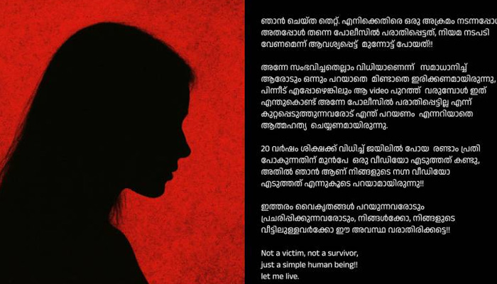 20 വർഷം ശിക്ഷക്ക് വിധിച്ച് ജയിലിൽ പോയ രണ്ടാം പ്രതി പോകുന്നതിന് മുൻപേ ഒരു വീഡിയോ എടുത്തത് കണ്ടു. അതിൽ ഞാൻ ആണ് നിങ്ങളുടെ നഗ്ന വീഡിയോ എടുത്തത് എന്നുകൂടെ പറയാമായിരുന്നു!! ഇത്തരം വൈകൃതങ്ങൾ പറയുന്നവരോടും പ്രചരിപ്പിക്കുന്നവരോടും, നിങ്ങൾക്കോ, നിങ്ങളുടെ വീട്ടിലുള്ളവർക്കോ ഈ അവസ്ഥ വരാതിരിക്കട്ടെ!!