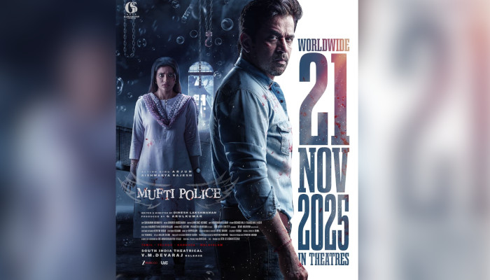 അർജുൻ സർജ, ഐശ്വര്യ രാജേഷ് എന്നിവരെ പ്രധാന കഥാപാത്രങ്ങളാക്കി നവാഗതനായ ദിനേശ് ലക്ഷ്മണൻ രചിച്ചു സംവിധാനം ചെയ്ത “മഫ്തി പോലീസ്” റിലീസ് തീയതി പുറത്ത്. 2025 നവംബർ 21 നു ചിത്രം ആഗോള റിലീസായെത്തും. ജി എസ് ആർട്സിന്റെ ബാനറിൽ ജി അരുൾകുമാർ ആണ് ചിത്രം നിർമ്മിക്കുന്നത്. ഒരു ക്രൈം ത്രില്ലർ ആയൊരുക്കിയ ചിത്രത്തിന്റെ ടീസർ മികച്ച പ്രേക്ഷക ശ്രദ്ധ നേടിയിരുന്നു. പ്രേക്ഷകരെ ആകാംഷയുടെ മുൾമുനയിൽ നിർത്തുന്ന ചിത്രമാണിത് എന്ന സൂചനയാണ് ടീസർ നൽകുന്നത്.
