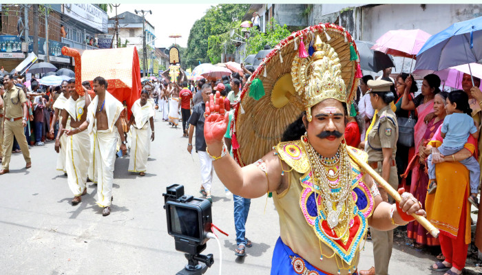 അനൗൺസ്മെന്റ് വാഹനത്തിനു പിന്നാലെ പഴയ കാലത്തെ രാജവിളംബരത്തെ അനുസ്മരിപ്പിച്ച് പെരുമ്പറ മുഴക്കി നകാരയും മാവേലി തമ്പുരാനുമെത്തി. സ്കൂൾ കുട്ടികളുടെ സ്കൗട്ട്സിനും വിവിധങ്ങളായ കലാ സംഘങ്ങൾക്കും പിന്നാലെയെത്തിയ പുലികളി, കരകാട്ടം, പടയണി, ഗരുഡൻ പറവ, കാവടി, ചിന്ത് മേളം, കുമ്മാട്ടി, വിവിധങ്ങളായ തെയ്യങ്ങൾ, ബൊമ്മലാട്ടം, മയിൽ നൃത്തം, കൃഷ്ണനാട്ടം, പുരാണ കഥാപാത്രങ്ങൾ, പ്രച്ഛന്നവേഷ രൂപങ്ങൾ തുടങ്ങി നിരവധിയായ നാടൻ കലാരൂപങ്ങൾ രാജവീഥികൾ നിറഞ്ഞാടി. സമകാലിക സംഭവങ്ങളും പുരാണങ്ങളും പ്രമേയമാക്കിയ നിശ്ചല ദൃശ്യങ്ങളും ഘോഷയാത്രയുടെ പകിട്ടേറ്റി.