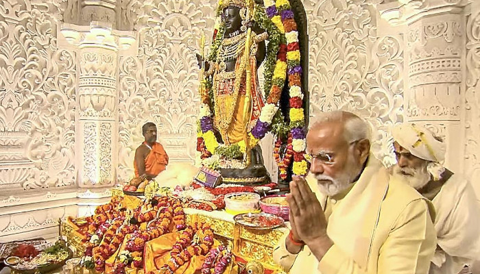 ഒരുദാഹരണമെടുക്കുക. മോഡിയുടെ പ്രസംഗത്തില് താന് കഴിഞ്ഞ ദിവസം രാമസേതുവിൽ ഉണ്ടായിരുന്നുവെന്ന് പറയുന്നു. രാവണനെ തോല്പിച്ച ശേഷം രാമനും അയോധ്യയിലേക്കുള്ള തന്റെ മടക്കയാത്ര ആ സ്ഥലത്ത് നിന്ന് ആരംഭിച്ചതെങ്ങനെയെന്നും അദ്ദേഹം അനുസ്മരിക്കുന്നു. രാമനും താനും സമമാണെന്ന ഭംഗ്യന്തരേണയുള്ള അവകാശപ്പെടലാണ് ഇവിടെ നടക്കുന്നത്. മോഡി തോല്പിച്ച രാവണന് ആരാണെന്ന ചോദ്യത്തിന് നമുക്ക് ഭാവിയില് ഉത്തരം കിട്ടുമായിരിക്കും. 2014ല് പഴയ പാര്ലമെന്റ് മന്ദിരത്തിലേക്ക് കയറുമ്പോള് പടിക്കെട്ടില് വീണ് തൊഴുത മോഡിയുടെ ചിത്രം നമ്മുടെ മനസിലുണ്ട്. അങ്ങനെ പാര്ലമെന്റിലേക്ക് കയറിയ നരേന്ദ്ര മോഡി ജനാധിപത്യം തകര്ക്കുകയും പകരം തന്നെത്തന്നെ പ്രതിഷ്ഠിക്കുകയും ചെയ്തതാണ് 10 വര്ഷങ്ങള്ക്കുശേഷം ഇന്ത്യയുടെ അനുഭവം. തിങ്കളാഴ്ച രാമക്ഷേത്രത്തിലും വീണുതൊഴുന്ന മോഡിയുടെ ചിത്രം പുറത്തുവന്നിട്ടുണ്ട്. അതുകൊണ്ട് തന്റെ പ്രസംഗത്തിലുടനീളം രാമനോട് സാദൃശ്യം പറഞ്ഞതും ഇന്ത്യന് ജനാധിപത്യത്തിന്റെ സമകാലികാവസ്ഥയും വച്ച് നോക്കിയാല് രാമനോട്, മോഡിയെ ഭയക്കണമെന്ന മുന്നറിയിപ്പ് നല്കാനാണ് ഭക്തര്ക്ക് തോന്നുക. മോഡീസ്തുതി കടുത്തുകയറി നാളെ അദ്ദേഹത്തെ ദൈവമായി അവതരിപ്പിച്ചാലും അത്ഭുതപ്പെടേണ്ടതില്ല.