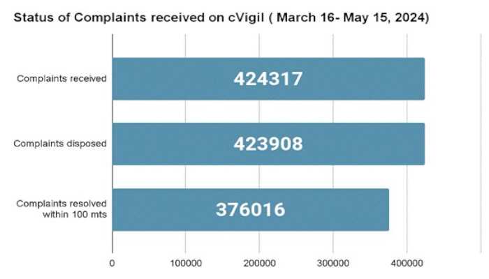 ലോക്സഭാ തെരഞ്ഞെടുപ്പില്‍ പെരുമാറ്റച്ചട്ട ലംഘനങ്ങള്‍ അറിയിക്കാനുള്ള സി-വിജില്‍ ആപ്പിലൂടെ ലഭിച്ചത് 4.24 ലക്ഷം പരാതികള്‍. ഇവയില്‍ 99 ശതമാനവും തീര്‍പ്പാക്കിയതായും തെരഞ്ഞെടുപ്പ് കമ്മിഷന്‍ അറിയിച്ചു. 4,23,908 പരാതികളില്‍ പരിഹാരം കണ്ടതായി തെരഞ്ഞെടുപ്പ് കമ്മിഷന്‍ വാര്‍ത്താക്കുറിപ്പില്‍ അറിയിച്ചു. ശേഷിക്കുന്ന 409 കേസുകളിൽ നടപടി പുരോഗമിക്കുന്നു. ഏകദേശം, 89 പരാതികളും 100 മിനിറ്റിനുള്ളില്‍ പരിഹരിച്ചതായും കേന്ദ്ര തെരഞ്ഞെടുപ്പ് കമ്മീഷൻ അറിയിച്ചു.