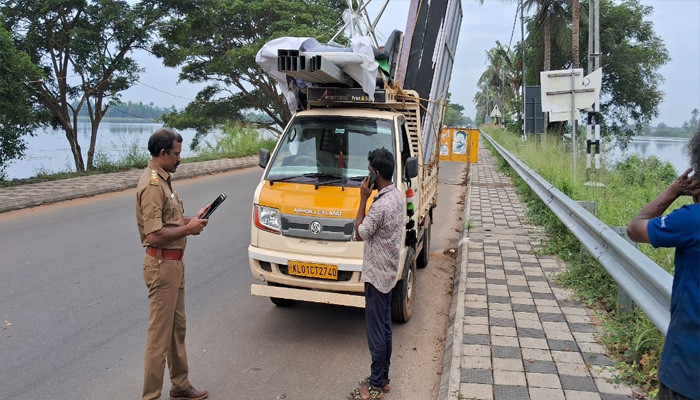 ലൈസന്സില്ലാതെ ഗുഡ്സ് വാഹനം ഓടിച്ച ഡ്രൈവര്ക്കും വാഹന ഉടമയ്ക്കുംഎതിരെ കേസ് .പള്ളാത്തുരുത്തിയില് മോട്ടോർ വാഹന വകുപ്പ് എൻഫോഴ്സ്മെന്റ് വിഭാഗം നടത്തിയ പരിശോധനയില് കൈകാണിച്ചിട്ട് നിറുത്താതിരുന്ന തിരുവനന്തപുരത്തുനിന്നും വന്ന ഗുഡ്സ് വാഹനം പിന്തുടർന്ന് പിടികൂടി. പരിശോധനയിൽ അപകടകരമായ രീതിയിൽ പുറത്തേക്ക് തള്ളി നിൽക്കുന്ന ഇരുമ്പ് പൈപ്പുകളും മറ്റു സാമഗ്രികളും കണ്ടെത്തി. തുടര്ന്നുള്ള പരിശോധനയിൽ ഡ്രൈവർക്ക് ഡ്രൈവിംഗ് ലൈസൻസ് ഇല്ലാതെയാണ് ഇത്രയും ദൂരം ഓടിച്ചു വന്നതെന്നും ഈ വാഹനത്തിന് പുക പരിശോധന സർട്ടിഫിക്കറ്റും ഇൻഷ്വറൻസും ഇല്ലെന്നും കണ്ടെത്തി.കെഎൽ 01 ct 2740 എന്ന രജിസ്ട്രേഷൻ നമ്പറോടുകൂടിയ വാഹനത്തില് കൊച്ചി മറൈൻ ഡ്രൈവിലേക്ക് എക്സിബിഷൻ നടത്തുന്നതിനായുള്ള സാമഗ്രികൾ ആയിരുന്നു ഉണ്ടായിരുന്നത്. തിരുവനന്തപുരം സ്വദേശി ബൈജു എസ് എല് ആണ് വാഹനത്തിന്റെ ഉടമ. കാര്യവട്ടം സ്വദേശി രഞ്ജിത്ത് ആയിരുന്നു വാഹനം ഓടിച്ചിരുന്നത് . വാഹനത്തിന് 34250 രൂപ പിഴ ഈടാക്കി. കഴിഞ്ഞ ദിവസം നടത്തിയ വാഹന പരിശോധനകളില് 22 കേസുകളിൽ നിന്നായി 99600 രൂപ പിഴയും ഈടാക്കി. മോട്ടോർ വാഹന വകുപ്പ് ആലപ്പുഴ എൻഫോഴ്സ്മെന്റ് വിഭാഗത്തിലെ മോട്ടോർ വെഹിക്കിൾ ഇൻസ്പെക്ടർ ആയ പി വി ബിജുവും ഡ്രൈവർ ടോജോ തോമസുംആണ് പരിശോധന നടത്തിയത്.