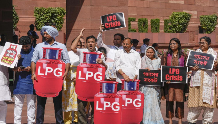 പശ്ചിമേഷ്യന്‍ യുദ്ധത്തിന്റെ പശ്ചാത്തലത്തില്‍ രാജ്യം നേരിടുന്ന പാചക വാതക പ്രതിസന്ധി ഉയര്‍ത്തി പാര്‍ലമെന്റിന് അകത്തും പുറത്തും പ്രതിപക്ഷ പ്രതിഷേധം. പ്രതിപക്ഷം സര്‍ക്കാരിനെതിരെ തിരിഞ്ഞതോടെ ലോക്‌സഭ സ്തംഭിച്ചു.