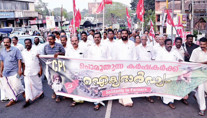 ഡൽഹിയിൽ സമരം ചെയ്യുന്ന കർഷകര്ക്കും ഇന്ന് നടക്കുന്ന തൊഴിലാളി, കര്ഷക പ്രക്ഷോഭത്തിനും ഐക്യദാർഢ്യം പ്രഖ്യാപിച്ച് സിപിഐ നേതൃത്വത്തില് വ്യാപക പ്രകടനങ്ങള് നടന്നു. ലോക്കൽ, മണ്ഡലം കേന്ദ്രങ്ങളില് പന്തം കൊളുത്തി പ്രകടനങ്ങളും നടന്നു. മിനിമം താങ്ങുവില അടക്കമുള്ള ന്യായമായ ആവശ്യങ്ങൾ ഉന്നയിച്ചാണ് കർഷകർ ഡൽഹിയിലേക്ക് സമരത്തിനെത്തിയത്. കിരാതമായ മർദനം അഴിച്ചുവിട്ടുകൊണ്ടാണ് മോഡി ഭരണം അന്നദാതാക്കളുടെ ജീവിത സമരത്തെ നേരിടുന്നത്. ഈ വഞ്ചനയെ ചോദ്യം ചെയ്തുള്ള കർഷക സമരത്തോടൊപ്പവും ഇന്ത്യൻ ജനത അചഞ്ചലമായി നിൽക്കുമെന്ന പ്രഖ്യാപനവുമായാണ് ഐക്യദാര്ഢ്യ പ്രകടനങ്ങള് സംസ്ഥാന വ്യാപകമായി നടന്നത്.