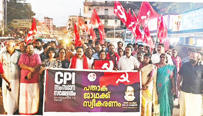 സിപിഐ സംസ്ഥാന സമ്മേളനത്തിന്റെ മുന്നോടിയായുള്ള പതാക ജാഥയ്ക്ക് മലപ്പുറം, പാലക്കാട്, തൃശൂര്, എറണാകുളം ജില്ലകളില് ഉജ്ജ്വല സ്വീകരണം. രാവിലെ മലപ്പുറം കുന്നുമ്മല് കെഎസ്ആര്ടിസി പരിസരത്ത് സ്വീകരണ യോഗം സിപിഐ സംസ്ഥാന അസി. സെക്രട്ടറി പി പി സുനീര് എം പി ഉദ്ഘാടനം ചെയ്തു. ജില്ലാ സെക്രട്ടറി പി കെ കൃഷ്ണദാസ് അധ്യക്ഷത വഹിച്ചു. പാലക്കാട് കുളപ്പുള്ളിയിൽ ജില്ലാ സെക്രട്ടറി സുമലതാ മോഹൻദാസ്, കെ പി സുരേഷ് രാജ് തുടങ്ങിയവര് ചേര്ന്ന് സ്വീകരിച്ചു.