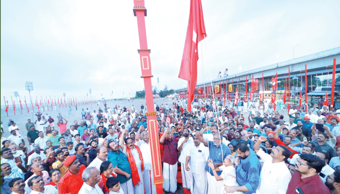 കടലലകള്ക്കു മീതെ ആര്ത്തിരമ്പിയ ജനസാഗരത്തെ സാക്ഷിയാക്കി സിപിഐ സംസ്ഥാന സമ്മേളനത്തിന് പതാക ഉയര്ന്നു. കടപ്പുറത്ത് ഒരുക്കിയ അതുല് കുമാര് അഞ്ജാന് നഗറില് സ്വാതന്ത്ര്യസമര സേനാനി പി കെ മേദിനിയാണ് ജനകോടികളുടെ അഭിമാനമായ ചെമ്പതാക വാനിലുയര്ത്തിയത്. പുന്നപ്ര‑വയലാറിലെ രക്തതാരകങ്ങള്ക്കും കയ്യൂരിലെയും കരിവെള്ളൂരിലേയുമടക്കം രക്തസാക്ഷികള്ക്കും ആദരമര്പ്പിച്ച മുദ്രാവാക്യങ്ങള് ഇടിനാദം പോലെ ഉയര്ന്നപ്പോള് ശതാബ്ദി സ്മരണയായി നൂറു ചെങ്കൊടികളും ഉയര്ന്നു.