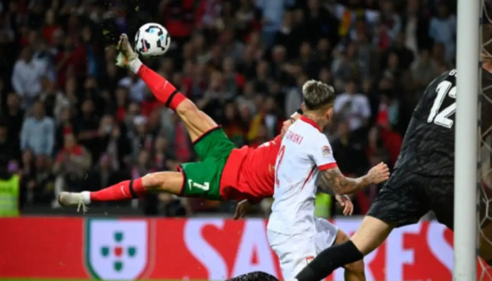 ക്രിസ്റ്റ്യാനോ റൊണാള്ഡോ വീണ്ടുമൊരു ബൈസൈക്കിള് കിക്കുമായി നിറഞ്ഞാടിയപ്പോള് യുവേഫ നേഷന്സ് ലീഗില് പോര്ച്ചുഗലിന് വമ്പന് വിജയം. പോളണ്ടിനെ നേരിട്ട പറങ്കിപ്പട ഒന്നിനെതിരെ അഞ്ച് ഗോളുകളുടെ വിജയമാണ് സ്വന്തമാക്കിയത്. മത്സരത്തില് റൊണാള്ഡോ ഇരട്ടഗോളുകള് നേടി. റഫേൽ ലിയാവോ, ബ്രൂണോ ഫെർണാണ്ടസ്, പെഡ്രോ നെറ്റോ എന്നിവരാണ് പോർച്ചുഗലിന്റെ മറ്റ് സ്കോറർമാർ. ഡൊമിനിക്ക് മാർക്സുക്കാണ് പോളണ്ടിനായി വലകുലുക്കിയത്. വിജയത്തോടെ പോര്ച്ചുഗല് ക്വാര്ട്ടര് ഫൈനലില് കടന്നു.
