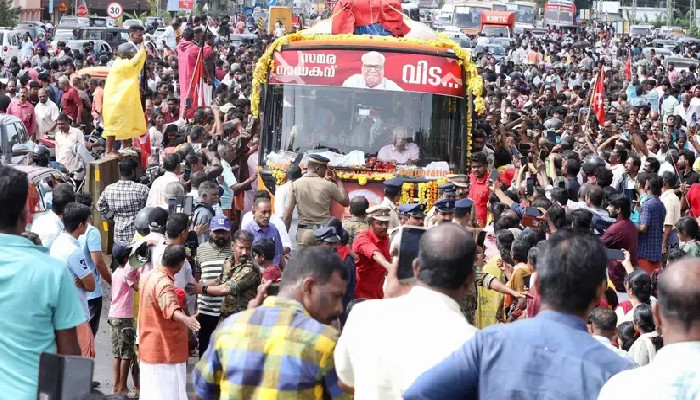 മുന് മുഖ്യമന്ത്രിയും മുതിര്ന്ന കമ്മ്യൂണിസ്റ്റ് നേതാവുമായ വിഎസ് അച്യുതാനന്ദന് വിട നല്കി ആലപ്പുഴ ഡിസി ഓഫീസ്. അദ്ദേഹത്തിന്റെ ഭൗതികശരീരവും വഹിച്ചുകൊണ്ടുള്ള വിലാപയാത്ര ഇനി ക്രിയേഷന് ഗ്രൗണ്ടിലേക്ക്. പ്രിയ സഖാവിനെ കൺനിറയെ കാണാനായി ജനസാഗരമാണ് എത്തിയത്. 24 മണിക്കൂര് നീണ്ട വിലാപയാത്രയ്ക്ക് ശേഷം ഉച്ചയോടെ പുന്നപ്രയിലെ വേലിക്കകത്ത് വീട്ടിലെത്തിച്ച വി എസിന്റെ മൃതദേഹം ശേഷം പാര്ട്ടി ജില്ലാ കമ്മിറ്റി ഓഫീസിലേക്ക് എത്തിച്ചത്. സമയക്രമം പാലിക്കുന്നതിനായി ഡി സി ഓഫീസിലെ പൊതുദർശന സമയം ചുരുക്കിയിരുന്നു. തുടർന്ന് ആലപ്പുഴ ബീച്ചിലെ റിക്രിയേഷൻ ഗ്രൗണ്ടിൽ പൊതുദർശനം നടത്തും. അതിനുശേഷം, അദ്ദേഹത്തിന്റെ ആഗ്രഹപ്രകാരം വലിയ ചുടുകാട്ടിൽ മൃതദേഹം സംസ്കരിക്കും. തങ്ങളുടെ പ്രിയ നേതാവിനെ അവസാനമായി ഒരു നോക്ക് കാണാനും അന്ത്യാഭിവാദ്യം അർപ്പിക്കാനുമായി ആയിരക്കണക്കിന് ജനങ്ങളാണ് തടിച്ചുകൂടിയിരിക്കുന്നത്.
