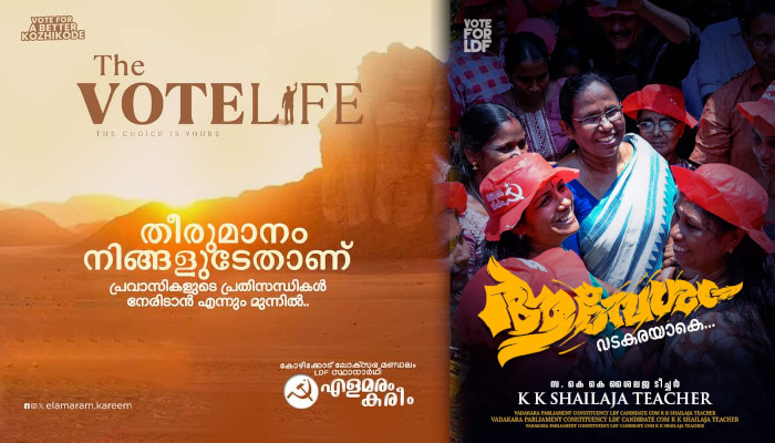 തിയേറ്ററുകളിൽ ജനശ്രദ്ധ നേടി മുന്നേറുന്ന സിനിമകളുടെ പോസ്റ്ററുകൾ തെരഞ്ഞെടുപ്പ് പ്രചാരണ രംഗത്തും ആവേശം വിതറുന്നു. ജിത്തു മാധവൻ ഒരുക്കിയ ‘ആവേശം’ എന്ന ചിത്രമുൾപ്പെടെ അടുത്തിറങ്ങിയ സിനിമകളുടെ പോസ്റ്ററുകളിൽ ചില മാറ്റങ്ങൾ വരുത്തിയാണ് വിവിധ മുന്നണികൾ സാമൂഹിക മാധ്യമങ്ങളിൽ തെരഞ്ഞെടുപ്പ് പ്രചാരണത്തിന് ഉപയോഗിക്കുന്നത്. ‘ആവേശം.. വടകരയാകെ’ എന്ന തലക്കെട്ടിലാണ് എൽഡിഎഫ് വടകര പാർലിമെന്റ് മണ്ഡലം സ്ഥാനാർഥി കെ കെ ശൈലജയുടെ പോസ്റ്റർ പുറത്തിറക്കിയത്. മാസ് മസാല എന്റർടെയ്നറായ സിനിമയുടെ ആവേശം പോസ്റ്ററിൽ നിറഞ്ഞു നിൽക്കുന്നതുപോലെ കെ കെ ശൈലജ വടകരയിൽ ഉയർത്തുന്ന ആവേശം പോസ്റ്ററിലും അറിയാൻ കഴിയും.