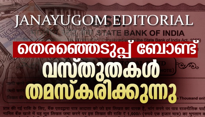 രാഷ്ട്രീയപാർട്ടികൾ പണമാക്കിമാറ്റിയ തെരഞ്ഞെടുപ്പ് ബോണ്ടുകളുടെ വിശദാംശങ്ങൾ വെളിപ്പെടുത്താനുള്ള സമയം ജൂൺ 30 വരെ നീട്ടിനൽകണമെന്ന സ്റ്റേറ്റ് ബാങ്ക് ഓഫ് ഇന്ത്യയുടെ ആവശ്യം, കേന്ദ്രഭരണം കയ്യാളുന്ന ബിജെപിയെ അതുമൂലം ഉണ്ടാവുന്ന കടുത്ത അമ്പരപ്പിൽനിന്നും രക്ഷിക്കാൻ ധനമന്ത്രാലയം നടത്തുന്ന കുത്സിതശ്രമത്തിന്റെ ഭാഗമാണ്. 2017ലെ തെരഞ്ഞെടുപ്പ് ബോണ്ട് പദ്ധതി, വിവരാവകാശമടക്കം ഭരണഘടനാ മാനദണ്ഡങ്ങൾക്ക് വിരുദ്ധവും ബിജെപിക്ക് വൻതുകകൾ നൽകുന്ന കോർപറേറ്റുകൾക്ക് നിയമവിരുദ്ധമായി ഒത്താശചെയ്യാൻ ലക്ഷ്യംവച്ചുള്ളതുമാണെന്ന് കണ്ടെത്തിയ സുപ്രീം കോടതി, ബോണ്ട് സംബന്ധിച്ച വിശദാംശങ്ങൾ മാർച്ച് ആറിനകം ഇലക്ഷൻ കമ്മിഷന് എസ്ബിഐ കൈമാറണമെന്നും അത് കമ്മിഷന് വെബ്സൈറ്റിൽ മാർച്ച് 13നകം പ്രസിദ്ധീകരിക്കണമെന്നും നിർദേശിച്ചിരുന്നു. തെരഞ്ഞെടുപ്പ് ബോണ്ട് സംബന്ധിച്ച വിശദാംശങ്ങൾ വെളിപ്പെടുത്താൻ എസ്ബിഐക്ക് നൽകിയ 20ദിവസ കാലാവധി അവസാനിക്കുന്നതിന് ഒരുദിവസം മുമ്പാണ് പ്രസ്തുത വിവരങ്ങൾ കേന്ദ്രീകൃതമായി ശേഖരിച്ചിട്ടില്ലെന്ന അവിശ്വസനീയമായ വാദവുമായി അവർ കോടതിയെ സമീപിച്ചത്. ഏപ്രിൽ, മേയ് മാസങ്ങളിൽ നടക്കേണ്ട ലോക്സഭാ തെരഞ്ഞെടുപ്പിന് മുമ്പ് തെരഞ്ഞെടുപ്പ്ഫലത്തെ സ്വാധീനിച്ചേക്കാവുന്നതും തെരഞ്ഞെടുപ്പ് ബോണ്ടുവഴി ഭരണകക്ഷി നടത്തിയ ഭരണഘടനാവിരുദ്ധ രാഷ്ട്രീയ അട്ടിമറി തുറന്നുകാട്ടുന്നതുമായ വസ്തുതകൾ തെരഞ്ഞെടുപ്പ് ഫലപ്രഖ്യാപനത്തിന് മുമ്പ് പുറത്തുവരരുതെന്ന ലക്ഷ്യത്തോടെയാണ് ധനമന്ത്രാലയത്തിന്റെ നിർദേശാനുസരണം എസ്ബിഐ നീക്കം. തങ്ങൾക്ക് ലഭ്യമായ 20 ദിവസ കാലാവധിക്കുള്ളിൽ വിശദാംശങ്ങൾ ശേഖരിക്കുന്നതിൽ എന്ത് പുരോഗതി കൈവരിച്ചുവെന്ന് എസ്ബിഐ കോടതിയെ ബോധ്യപ്പെടുത്താൻ ശ്രമിച്ചിട്ടില്ലെന്ന് മാത്രമല്ല ബാങ്കിന്റെ അപേക്ഷയിൽ ചെയർമാന്റെയോ മാനേജിങ് ഡയറക്ടറുടെയോ സത്യവാങ്മൂലം ഉൾപ്പെടുത്തിയിട്ടുമില്ല.