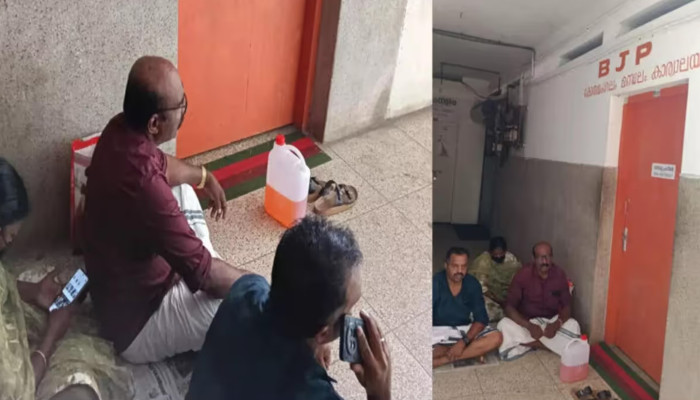 ബിജെപി കോതമംഗലം മണ്ഡലം കാര്യാലയത്തിന് മുന്നിൽ പെട്രോൾ കന്നാസുമായി കുടുംബത്തിന്റെ ആത്മഹത്യ ഭീഷണി. കുടുംബത്തിൽ നിന്ന് കൈക്കൂലിയായി 10.58 ലക്ഷം രൂപ വാങ്ങിയെന്നും തിരികെ നൽകണമെന്നും ആവശ്യപ്പെട്ടാണ് സമരം. ഓൺലൈൻ ട്രേഡിംഗിലൂടെ മകന് ലഭിച്ച പണവുമായി ബന്ധപ്പെട്ട കേസിൽ നിന്ന് ഒഴിവാക്കി തരാമെന്ന് പറഞ്ഞ് ബിജെപി കോതമംഗലം ഭാരവാഹികൾ ലക്ഷങ്ങൾ തട്ടിയെന്നാരോപിച്ചാണ് കുടുംബം ബിജെപി മണ്ഡലം ഓഫീസിന് മുന്നിൽ കുത്തിയിരുപ്പ് സമരം നടത്തിയത്. ചേലാട് സ്വദേശി ജോർജ്, ഭാര്യ, സഹോദരൻ എന്നിവരാണ് സമരം നടത്തിയത്.