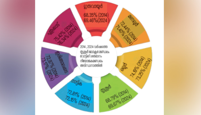 തൃശൂര് പാര്ലമെന്റ് മണ്ഡലത്തില് താമരയും വിരിയില്ല കൈപ്പത്തിയും നിവരില്ല എന്നാണ് വോട്ടിങ് കണക്കുകള് വ്യക്തമാക്കുന്നത്. 2024 ലെ ലോക്സഭ തെരഞ്ഞെടുപ്പിന്റെ പോളിങ് ശതമാനം കുറവാണെങ്കിലും 2014 ല് നടന്ന തെരഞ്ഞെടുപ്പിന് സമാനമായ കണക്കുകളാണ് പുറത്ത് വന്നിരിക്കുന്നത്. ഈ കണക്കുകളും വിവിധ മണ്ഡലങ്ങളിലെ വോട്ടിങ് രീതിയും മനസിലാക്കുമ്പോള് ഇടതുപക്ഷ ജനാധിപത്യ മുന്നണിയുടെ ‘സുനി‘ശ്ചിത വിജയമാണ് ഉണ്ടാകുക. ഇക്കുറി 72.9 ശതമാനം പോളിങ്ങാണ് തൃശൂര് ലോക്സഭ മണ്ഡലത്തില് രേഖപ്പെടുത്തിയത്. എല്ഡിഎഫ് സ്ഥാനാര്ത്ഥിയായ സി എന് ജയദേവന് 2014 ല് തെരഞ്ഞെടുപ്പില് വിജയിച്ചപ്പോള് 72.20% വോട്ടാണ് രേഖപ്പെടുത്തിയത്. 2014 ല് 12,74,081 വോട്ടര്മാരില് ആകെ 9,19,557 വേട്ടുകളാണ് പോള് ചെയ്തത്. ഇത്തവണ 1483055 വോട്ടര്മാരില് 1081125 വോട്ടുകളാണ് പോള്ചെയ്തത്.