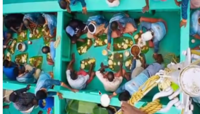 ആഴക്കടലിലും ആവേശം നിറച്ച് പൊന്നോണം. ആഴക്കടലിന്റെ മടിത്തട്ടില്, തിരമാലകളുടെ താരാട്ടിൽ, ഓണസദ്യയൊരുക്കിയാണ് ഒരു കൂട്ടം മത്സ്യത്തൊഴിലാളികളുടെ ഇത്തവണത്തെ ഓണാഘോഷം. അഴീക്കോട് വാകച്ചാർത്ത് എന്ന മത്സ്യബന്ധന വള്ളത്തിലെ തൊഴിലാളികളാണ് കടലിന് നടുവില് ഓണസദ്യയൊരുക്കിയത്. മീൻ പിടിക്കുന്നതിനിടയിലും ഉത്രാട ദിനം ആഘോഷിക്കാൻ അവർ തീരുമാനിച്ചതാണ് വ്യത്യസ്തമായ ഒരു ഓണാഘോഷമായത്.