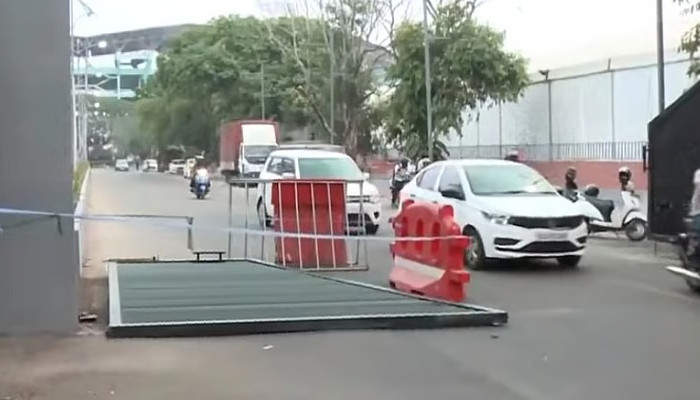 നവീകരിച്ച കലൂർ രാജ്യാന്തര സ്റ്റേഡിയത്തിന്റെ പ്രവേശ കവാടത്തിൽ സ്ഥാപിച്ചിരുന്ന കൂറ്റൻ ഗേറ്റ് തകർന്നു വീണു.ഇന്ന് വൈകീട്ട് അഞ്ച് മണിയോടെയാണ് അപകടം ഉണ്ടായത്. ബാനർജി റോഡിൽ നിന്ന് സ്റ്റേഡിയത്തിലേക്ക് പ്രവേശിക്കുന്നിടത്താണ് പുതിയ ഗേറ്റുകൾ സ്ഥാപിച്ചത്. വിവാദമായ സ്റ്റേഡിയം നവീകരണത്തിന്റെ ഭാഗമായി പുതിയ കവാടം നിർമിക്കുകയും ഇതിന് ഗേറ്റ് സ്ഥാപിക്കുകയായുമായിരുന്നു. ഇരു ഭാഗങ്ങളിലും രണ്ട് പാളികൾ വീതമുള്ള കൂറ്റൻ ഗേറ്റുകളാണ് പ്രവേശന കവാടത്തിൽ സ്ഥാപിച്ചത്. ഇതിൽ സ്റ്റേഡിയത്തിൽ നിന്നു മെട്രോ സ്റ്റേഷനിലേക്ക് വരുന്ന ഭാഗത്തെ ഗേറ്റുകളിൽ ഒന്നാണ് തകർന്നു വീണത്. മുകളിലെ ക്ലാമ്പിൽ നിന്നു ഭാരം താങ്ങാൻ സാധിക്കാതെ പൊട്ടി വീണതാകാമെന്നാണ് നിഗമനം.