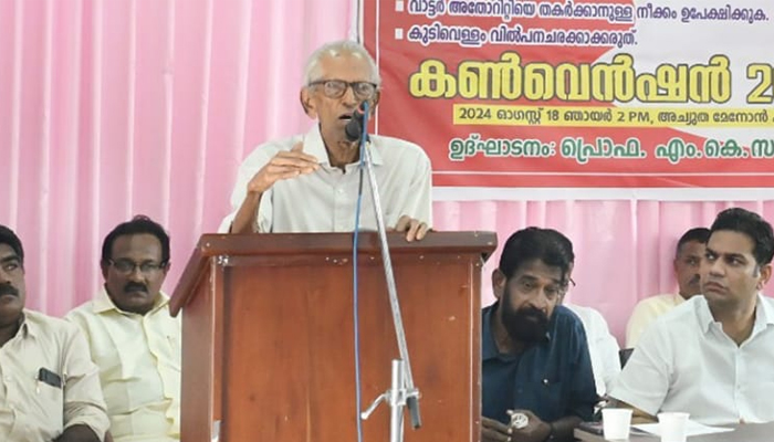 സുന്ദര മുഖത്തോടെ വരുന്ന ഹിംസ്ര ഭാവമാണ് കുടിവെള്ള സ്വകാര്യവൽക്കരണത്തിനു വരുന്ന സൂയുസ് കമ്പനിയുടേത്. അതിനാൽ ജനങ്ങളുടെ താൽപര്യ പ്രകാരം ഈ പദ്ധതിയിൽ നിന്നും സർക്കാർ പിൻമാറണമെന്ന് പ്രൊഫ എം കെ സാനു ആവശ്യപ്പെട്ടു. കൊച്ചി കോർപ്പറേഷനിലെ കുടിവെള്ള വിതരണം എ ഡി ബി നിർദേശ പ്രകാരം അന്താരാഷ്ട്ര കുടിവെള്ള വിതരണ കമ്പനി സൂയിസൈനെ ഏൽപ്പിക്കാനുള്ള നീക്കം ഉപേക്ഷിക്കണമെന്നാവശ്യപ്പെട്ട് കുടിവെള്ള സംരക്ഷണ സമിതി നേതൃത്വത്തിൽ എറണാകുളം സി അച്യുതമേനോൻ ഹാളിൽ സംഘടിപ്പിച്ച ജനകീയ കൺവെൻഷൻ ഉദ്ഘാടനം ചെയ്തു സംസാരിക്കുകയായിരുന്നു അദ്ദേഹം. കുടിവെള്ളം മനുഷ്യന്റെ അവകാശമാണ്. അത് ലാഭം കിട്ടുന്ന കച്ചവടമാക്കരുതെന്നും അദ്ദേഹം പറഞ്ഞു.