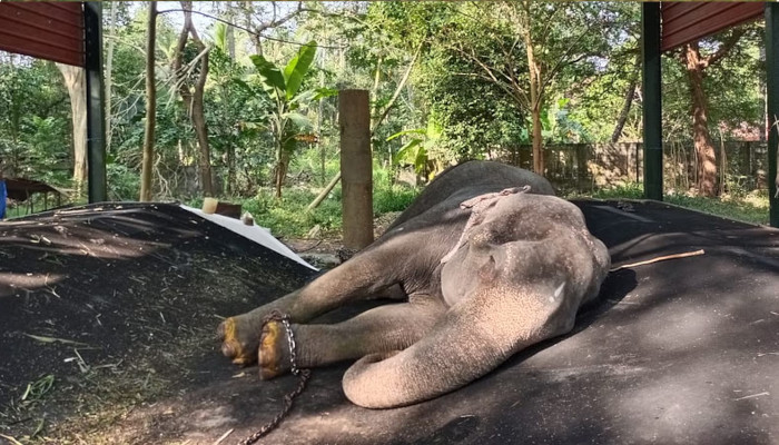 ആനക്കോട്ടയിലെ വെറ്ററിനറി ഡോ.വിവേക് ഉൾപ്പെടെയുള്ളവര് പറയുന്നു. വിദഗ്ധ ഡോക്ടർമാർ രണ്ട് നേരം ആനയെ പരിശോധിക്കുന്നുണ്ട്. പാദരോഗവും ആനയെ നന്നായി അലട്ടുന്നുണ്ട് ഇന്നും എഴുന്നേറ്റില്ലെങ്കിൽ ക്രെയിൻ ഉപയോഗിച്ച് എഴുന്നേല്പിച്ച് നിർത്തും എന്ന് ഡോ: വിവേക് പറഞ്ഞു