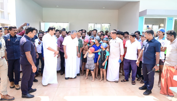 കാസർകോട് ജില്ലയിലെ നടക്കാവിൽ ജില്ലാ മൾട്ടിപർപ്പസ് സ്റ്റേഡിയം ഉദ്ഘാടനം ചെയ്ത് മുഖ്യമന്ത്രി കുരുന്നുകളോട് സംസാരിക്കുന്നു