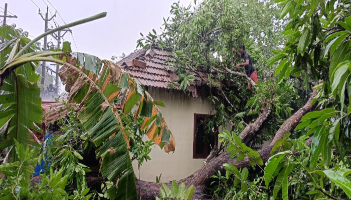 തൊണ്ടിക്കുഴ- നടയം റോഡില് മരവെട്ടിച്ചുവടിന് സമീപം റബര്മരം കടപുഴകി വീണ് വൈദ്യുതി പോസ്റ്റൊടിഞ്ഞു. ഇതുവഴിയുള്ള ഗതാഗതം രണ്ട് മണിക്കൂറോളം മുടങ്ങി. നാട്ടുകാര് ഏറെ പണിപ്പെട്ടാണ് മരം മുറിച്ച് നീക്കിയത്. റോഡില് വൈദ്യുതി ലൈനുകള് കിടക്കുന്നത് വാഹനയാത്രികര്ക്ക് തടസമാണ്. 10ല് അധികം മരങ്ങളാണ് തൊണ്ടിക്കുഴ മേഖലയില് മാത്രം ഒടിഞ്ഞുവീണത്.