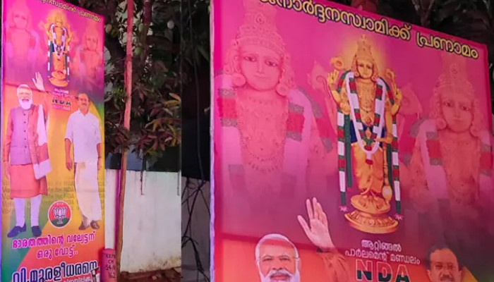 ശ്രീ ജനാർദ്ദന സ്വാമിക്ക് പ്രണാമം എന്നെഴുതിയ ഫ്ളെക്സിൽ വിഗ്രഹചിത്രവും അതോടൊപ്പം മോഡിയുടെയും വി മുരളീധരന്റെയും ചിത്രങ്ങളുമാണുള്ളത്. ഭാരതത്തിന്റെ വല്യേട്ടന് ഒരു വോട്ട് , വി മുരളീധരനെ വിജയിപ്പിക്കുക എന്നും ബോർഡിലുണ്ട്. സംഭവത്തിൽ എൽഡിഎഫ് തെരഞ്ഞെടുപ്പ് കമ്മീഷന് പരാതി നൽകി.
