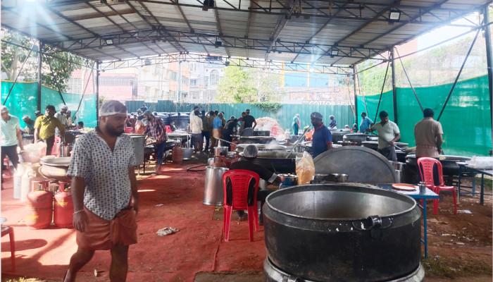സംസ്ഥാന സ്കൂൾ കായികമേളയിൽ ഭക്ഷണം വിളമ്പുന്നത് 16,000ത്തോളം പേർക്ക്. മഹാരാജാസ് കോളജ് ഗ്രൗണ്ടിലടക്കം സജ്ജീകരിച്ചിട്ടുള്ള പഴയിടം മോഹനൻ നമ്പൂതിരിയുടെ നേതൃത്വത്തിലുള്ള മുന്നൂറോളം പാചകക്കാർ വരുന്ന സംഘമാണ് ആറ് അടുക്കളകളിലായി ഭക്ഷണം തയ്യാറാക്കുന്നത്. മൽസരങ്ങൾ നടക്കുന്ന 12-ഓളം കേന്ദ്രങ്ങളിലാണ് ഭക്ഷണം എത്തിച്ച് നൽകുന്നത്. നാലിടങ്ങളിൽ നോൺ വെജ് ആഹാരങ്ങളും പാചകം ചെയ്യുന്നുണ്ട്. വെജിറ്റേറിയൻ ഭക്ഷണം മാത്രമാണ് പഴയിടത്തിന്റെ മേൽനോട്ടത്തിൽ പാചകം ചെയ്യുന്നത്, നോൺ വെജ് ആഹാരങ്ങൾ ഉണ്ടാക്കുന്നതിനായി അദ്ദേഹം മറ്റൊരാൾക്ക് സബ് കോൺട്രാക്ട് നൽകിയിരിക്കുകയാണ്. ഇതിനായി മാത്രം 50ൽ അധികം പേരാണ് എത്തിയിരിക്കുന്നത്.