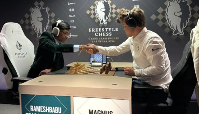 ഫ്രീ സ്റ്റൈല് ഗ്രാന്സ്ലാം ചെസ് ടൂര്ണമെന്റില് ലോക ഒന്നാം നമ്പര് ചെസ് താരം മാഗ്നസ് കാള്സണെ അട്ടിമറിച്ച് ഇന്ത്യന് ഗ്രാന്ഡ്സമാസ്റ്റര് ആര് പ്രഗ്നാനന്ദ. വെള്ളക്കരുക്കളുമായിറങ്ങിയ പ്രഗ്നാനന്ദ 39 നീക്കങ്ങളിലാണ് കാള്സണെ തോല്പിച്ചത്. നാലാം റൗണ്ട് മത്സരത്തിലാണ് പ്രഗ്നാനന്ദയുടെ വിജയം. തുടക്കം മുതല് ഒടുക്കം വരെ ഇന്ത്യന് ഗ്രാന്ഡ്മാസ്റ്റര് ആധിപത്യം പുലര്ത്തി. ജയത്തോടെ ക്വാര്ട്ടര് ഫൈനലിനും യോഗ്യത നേടി. 4.5 പോയിന്റുമായി പ്രഗ്നാനന്ദ ഗ്രൂപ്പിൽ ഒന്നാം സ്ഥാനത്തേക്കുയര്ന്നു. ഇതോടെ ക്ലാസിക്കൽ, റാപ്പിഡ്, ബ്ലിറ്റ്സ് ഫോർമാറ്റുകളിൽ ലോക ഒന്നാം നമ്പർ താരത്തെ തോൽപ്പിച്ചുവെന്ന നേട്ടത്തിലെത്താനും ഇന്ത്യയുടെ കൗമാര താരത്തിനായി.