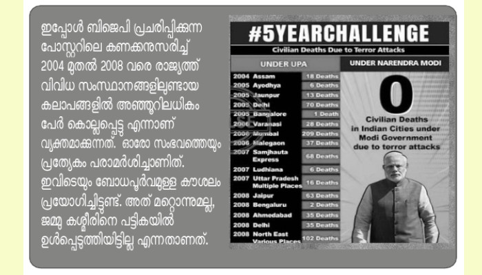 ഇപ്പോള്‍ ബിജെപി പ്രചരിപ്പിക്കുന്ന പോസ്റ്ററിലെ കണക്കനുസരിച്ച് 2004 മുതല്‍ 2008 വരെ രാജ്യത്ത് വിവിധ സംസ്ഥാനങ്ങളിലുണ്ടായ കലാപങ്ങളില്‍ അഞ്ഞൂറിലധികം പേര്‍ കൊല്ലപ്പെട്ടു എന്നാണ് വ്യക്തമാക്കുന്നത്. ഓരോ സംഭവത്തെയും പ്രത്യേകം പരാമര്‍ശിച്ചാണിത്. ഇവിടെയും ബോധപൂര്‍വമുള്ള കൗശലം പ്രയോഗിച്ചിട്ടുണ്ട്. അത് മറ്റൊന്നുമല്ല, ജമ്മു കശ്മീരിനെ പട്ടികയില്‍ ഉള്‍പ്പെടുത്തിയിട്ടില്ല എന്നതാണത്. കാരണം മോഡിയുടെ കാലയളവില്‍, പ്രത്യേകിച്ച് 2019ന് ശേഷം ഭീകരാക്രമണം കുറഞ്ഞുവെന്ന് നിരന്തരം അവകാശപ്പെടുമ്പോഴും എല്ലാ ദിവസവുമെന്നോണം അവിടെ ഭീകരരുമായുള്ള ഏറ്റുമുട്ടല്‍ വാര്‍ത്തകള്‍ വന്നുകൊണ്ടിരിക്കുന്നുണ്ട്. അതിനാലാണ് രാജ്യത്താകെയുള്ള ഭീകരാക്രമണത്തിന്റെ കണക്കില്‍ നിന്ന് ജമ്മു കശ്മീരിനെ ഒഴിവാക്കിയതെന്നതില്‍ സംശയമില്ല. മാത്രവുമല്ല, മണിപ്പൂരില്‍ നടന്നുകൊണ്ടിരിക്കുന്ന വംശീയ സംഘര്‍ഷങ്ങളും ഈ കണക്കില്‍ ഇല്ല. ഇരുവിഭാഗങ്ങള്‍ തമ്മിലുള്ള വംശീയ സംഘര്‍ഷമാണ് അവിടെ നടക്കുന്നതെങ്കിലും അയല്‍ രാജ്യങ്ങളിലെ ഭീകരസംഘടനാ ബന്ധമുണ്ടെന്ന് ആവര്‍ത്തിക്കുന്നത് മണിപ്പൂര്‍ മുഖ്യമന്ത്രി ബിരേണ്‍ സിങ് ഉള്‍പ്പെടെയുള്ളവരാണ്. എങ്കിലും പട്ടികയില്‍ മണിപ്പൂര്‍ ഇടംപിടിച്ചിട്ടില്ല. ഇതില്‍ നിന്നെല്ലാംതന്നെ ഭീകരാക്രമണം സംബന്ധിച്ച അവകാശവാദങ്ങള്‍ വസ്തുതാ വിരുദ്ധമാണെന്ന് ബോധ്യപ്പെടുന്നതാണ്. മാത്രമല്ല, മ്യാന്‍മറില്‍ നിന്ന് കടന്നെത്തുന്ന ഭീകരപ്രവര്‍ത്തനം വടക്കുകിഴക്കന്‍ അതിര്‍ത്തികളില്‍ നടക്കുന്നുവെന്ന് അതാതിടങ്ങളില്‍ വ്യത്യസ്ത സംഭവങ്ങളുണ്ടാകുമ്പോള്‍ മുഖ്യമന്ത്രിമാരും ബിജെപി ഉന്നതരും ആവര്‍ത്തിക്കുന്നതുമാണ്. എന്നിട്ടും ബിജെപി അവകാശപ്പെടുന്നതിനനുസരിച്ച് രാജ്യത്ത് ഒരു സാധാരണ പൗരന്‍പോലും ഭീകരാക്രമണത്തില്‍ മരിച്ചില്ലെന്ന അവകാശവാദം വാസ്തവ വിരുദ്ധമാണെന്ന് മാത്രമല്ല, വിഘടനവാദത്തെ സഹായിക്കുന്നതുമാണ്. കാരണം ഈ പ്രദേശങ്ങള്‍ വേറിട്ടുപോകണമെന്ന ആവശ്യമുന്നയിക്കുന്ന നിരവധി സംഘടനകള്‍ കശ്മീരിലായാലും ചില വടക്കു കിഴക്കന്‍ സംസ്ഥാനങ്ങളിലായാലും സജീവമാണ്. എന്നുമാത്രമല്ല രാജ്യത്തിന്റെ പല ഭാഗങ്ങളിലും പ്രത്യേകിച്ച് കശ്മീരില്‍ ഭീകരപ്രവര്‍ത്തനം വലിയ അളവില്‍ നിയന്ത്രിക്കുന്നതിന് സാധിച്ചിട്ടില്ലെന്ന് കേന്ദ്ര ആഭ്യന്തര മന്ത്രാലയത്തിന്റെ കണക്കുകള്‍തന്നെ വ്യക്തമാക്കുന്നുണ്ട്. രണ്ടാഴ്ച മുമ്പാണ് പൂഞ്ചില്‍ ഭീകര വിരുദ്ധ പ്രവര്‍ത്തനത്തിനിടെ മൂന്ന് പൗരന്മാര്‍ക്ക് ജീവഹാനിയുണ്ടായത്. അത് താഴ്‌വരയില്‍ വലിയ പ്രതിഷേധത്തിനും വിവാദത്തിനും കാരണമായിരുന്നതുമാണ്.