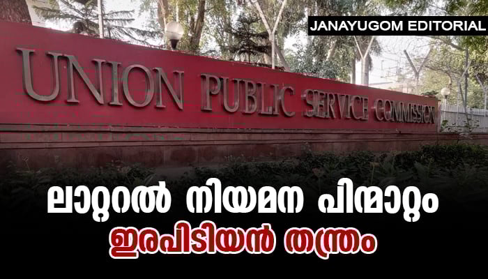 വിവിധ കേന്ദ്ര സർക്കാർ മന്ത്രാലയങ്ങളിലെയും വകുപ്പുകളിലെയും 45 ജോയിന്റ് സെക്രട്ടറി, ഡയറക്ടർ, ഡെപ്യൂട്ടി ഡയറക്ടർ തസ്തികകളിലേക്ക് ‘ലാറ്ററൽ’ നിയമനത്തിനുവേണ്ടിയുള്ള വിജ്ഞാപനം പിൻവലിക്കാൻ യൂണിയൻ പബ്ലിക് സർവീസ് കമ്മിഷന് മോഡി സർക്കാർ നിർദേശം. കേന്ദ്ര ഡിപാർട്മെന്റ് ഓഫ് പെഴ്സണൽ ആന്റ് ട്രെയിനിങ് മന്ത്രി ഡോ. ജിതേന്ദ്ര സിങ്ങാണ് ഇതുസംബന്ധിച്ച നിർദേശം യുപിഎസ്സി ചെയര്പേഴ്സണ് പ്രീതി സുധന് നൽകിയത്. കേന്ദ്ര സർക്കാരിന്റെ ഉന്നത ഉദ്യോഗസ്ഥ പദവികളിലേക്ക്, സംവരണമടക്കം മാനദണ്ഡങ്ങൾ ലംഘിച്ചുകൊണ്ട് കൂട്ടനിയമനം നടത്താനുള്ള മോഡി സർക്കാരിന്റെ നീക്കത്തിനെതിരെ പ്രതിപക്ഷത്തുനിന്നും ഭരണമുന്നണിയിലെ ഘടകകക്ഷികളിൽനിന്നും ശക്തമായ എതിർപ്പ് ഉയർന്നിരുന്നു. ഭരണമുന്നണിയിൽനിന്നും ഉയർന്ന എതിർപ്പ് അവഗണിച്ചുപോകുകയെന്നാൽ സർക്കാരിന്റെ നിലനില്പുതന്നെ അപകടത്തിലാവുമെന്ന തിരിച്ചറിവാണ് തങ്ങളുടെ കോർപറേറ്റ് അനുകൂല, പരിവാർ പ്രീണന നയങ്ങൾ തിടുക്കത്തിൽ പിൻവലിക്കാൻ മോഡി പ്രഭൃതികളെ നിർബന്ധിതമാക്കിയത്. ഇത് കേവലം ലാറ്ററൽ നിയമനത്തെമാത്രം ബാധിക്കുന്ന പ്രശ്നമല്ല. കഴിഞ്ഞ 10 വർഷത്തെ സ്വേച്ഛാധിപത്യ വാഴ്ചയിൽനിന്ന് വ്യത്യസ്തമായി ഒരു ജനാധിപത്യ സംവിധാനത്തിൽ, പ്രത്യേകിച്ചും മുന്നണി സംവിധാനത്തിൽ എങ്ങനെ ഭരണം മുന്നോട്ടുകൊണ്ടുപോകണം എന്നതിന്റെ ബാലപാഠം പാലിക്കാനുള്ള അവസരംകൂടിയാണ് ഇന്ത്യൻ ജനാധിപത്യം മോഡിക്കും ബിജെപിക്കും പരിവാറിനും നൽകുന്നത്. സിവിൽ സർവീസിലെ ലാറ്ററൽ നിയമനം ചില സർക്കാർ വകുപ്പുകളിലേക്കും സ്ഥാപനങ്ങളിലേക്കും പ്രത്യേക വൈദഗ്ധ്യമുള്ളവരെ പതിവ് ഉദ്യോഗസ്ഥ സംവിധാനങ്ങൾക്ക് പുറത്തുനിന്നും മാനദണ്ഡങ്ങൾ മറികടന്നും നിയമിക്കുന്നതിനെയാണ് വിവക്ഷിക്കുന്നത്. ഇന്ത്യൻ അഡ്മിനിസ്ട്രേറ്റീവ് സർവീസ് (ഐഎഎസ്) അടക്കമുള്ള ഉന്നത തസ്തികകളിലേക്കാണ് നിയമനങ്ങൾ നടക്കുക. പതിവ് രീതിയിൽ യുപിഎസ്സി പരീക്ഷയിലൂടെ കേന്ദ്ര സർവീസിൽ പ്രവേശിക്കുന്നവർക്ക് ഈ തസ്തികയിലേക്ക് അപേക്ഷിക്കാൻ വിലക്കുണ്ടെങ്കിലും സംസ്ഥാന സർവീസിലും പൊതുമേഖലാ സ്ഥാപനങ്ങളിലുമുള്ള ഐഎഎസുകാർക്ക് അപേക്ഷിക്കാനാവും. പതിവ് നിയമന പ്രക്രിയയ്ക്ക് പുറത്തുള്ള ഈ നിയമന സംവിധാനത്തിന് സംവരണതത്വങ്ങൾ ബാധകമല്ല.