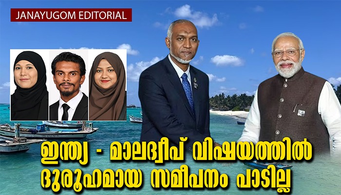 മറ്റൊരു അതിർത്തി രാജ്യമായ മാലദ്വീപിലെ മന്ത്രിമാരും ഉന്നത നേതാക്കളായ ചിലരും ഇന്ത്യയുടെ പ്രധാനമന്ത്രി നരേന്ദ്ര മോഡിയെ കുറിച്ച് നടത്തിയ പരാമർശങ്ങൾ അത്യന്തം അപലപനീയവും പ്രതിഷേധാർഹവുമാണ്. കഴിഞ്ഞയാഴ്ച നരേന്ദ്ര മോഡി നടത്തിയ ലക്ഷദ്വീപ് സന്ദർശനവും കടൽത്തീരത്ത് ഉലാത്തുന്ന ദൃശ്യങ്ങൾ സമൂഹമാധ്യമങ്ങളിലും മറ്റും വ്യാപകമായി പ്രചരിപ്പിച്ചതുമായി ബന്ധപ്പെട്ടാണ് അപലപനീയമായ പരാമർശങ്ങൾ മാലദ്വീപിലെ മന്ത്രിമാരുൾപ്പെടെയുള്ളവരിൽ നിന്നുണ്ടായത്. മന്ത്രിമാരായ മറിയം ഷിവുന, മാൽഷ ഷെരീഫ്, അബ്ദുല്ല മഹ്സൂം മാജിദ് എന്നിവരാണ് പരാമർശങ്ങൾ നടത്തിയത്. ഏറ്റവും മോശമായ പരാമർശം നടത്തിയത് യുവജനകാര്യ വകുപ്പ് മന്ത്രി മറിയം ഷിവുനയായിരുന്നു. മോഡിയെ കോമാളിയെന്ന് അപഹസിച്ച അവർ, ഇസ്രയേലിന്റെ പാവ മിസ്റ്റർ നരേന്ദ്ര മോഡി ലൈഫ് ജാക്കറ്റ് ഉപയോഗിച്ച് ഡൈവ് ചെയ്യുന്നു എന്നായിരുന്നു സമൂഹമാധ്യമമായ എക്സിൽ കുറിച്ചത്. മാലദ്വീപിന് ഈ മേഖലയിൽ ഇന്ത്യൻ സൈന്യത്തിന്റെ സാന്നിധ്യം ആവശ്യമില്ലെന്നും ഷിവുന ട്വീറ്റ് ചെയ്തിരുന്നു. വൻവിവാദം ഉയർന്നതിനെ തുടർന്ന് മറിയം ഷിവുന പ്രസ്തുത പരാമർശം നീക്കി. ഇന്ത്യ മാലദ്വീപിനെ ലക്ഷ്യംവയ്ക്കുന്നുണ്ടെന്നും ബീച്ച് ടൂറിസത്തിൽ ഇന്ത്യ വെല്ലുവിളി നേരിടുന്നുണ്ടെന്നും മറ്റൊരു മന്ത്രിയായ അബ്ദുല്ല മഹ്സൂം മാജിദും പറഞ്ഞിരുന്നു. മന്ത്രിമാർക്ക് പുറമെ പ്രോഗ്രസിവ് പാർട്ടി കൗൺസിൽ അംഗം സാഹിദ് റമീസ് ഉൾപ്പെടെയുള്ളവരും വ്യക്തിപരമായ അധിക്ഷേപം പുറപ്പെടുവിച്ചിരുന്നു.