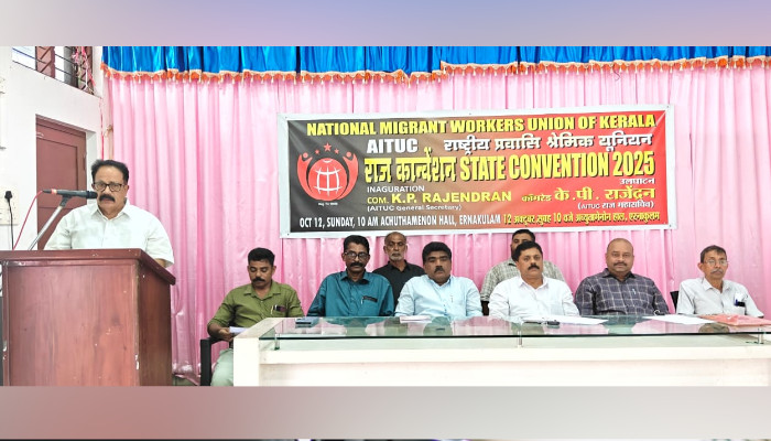 അതിഥി തൊഴിലാളികൾക്ക് തൊഴിൽ സുരക്ഷയും വേതനവും ഉറപ്പാക്കണമെന്ന് എഐടിയുസി സംസ്ഥാന ജനറൽ സെക്രട്ടറി കെ പി രാജേന്ദ്രൻ. കൃത്യമായ വേതനം ലഭിക്കുന്നതിനും സാമൂഹിക സുരക്ഷയും മറ്റ് ആനുകൂല്യങ്ങളും ലഭ്യമാകുന്നതിനും ശരിയായ നിയമ നിർമ്മാണം വേണമെന്നും അദ്ദേഹം ആവശ്യപ്പെട്ടു. എറണാകുളം സി അച്യുതമേനോൻ ഹാളിൽ നടന്ന നാഷ്ണൽ മൈഗ്രന്റ് വർക്കേഴ്സ് യൂണിയൻ ഓഫ് കേരളയുടെ സംസ്ഥാന കൺവൻഷൻ ഉദ്ഘാടനം ചെയ്ത് സംസാരിക്കുകയായിരുന്നു അദ്ദേഹം. ഇന്ത്യൻ ഭരണഘടന ഒരോ പൗരനും ജീവിക്കാനും ഇഷ്ടമുള്ള തൊഴിലെടുക്കാനും അവകാശം നൽകുന്നതുപോലെ അതിഥി തൊഴിലാളികളുടെ തൊഴിൽ മേഖലകളിലെല്ലാം അവരുടെ സുരക്ഷ ഉറപ്പാക്കണം. തോട്ടം മേഖല, നിർമ്മാണ മേഖല,ഹോട്ടൽ-റസ്റ്റോറന്റ് മേഖല,ബാർബർ ഷോപ്പ്,പെട്രോൾ പമ്പുകൾ തുടങ്ങി എല്ലാ തൊഴിൽ മേഖലയിലും ഉൽസാഹം പൂർവം പണിയെടുക്കുന്നവാരാണ് അതിഥി തൊഴിലാളികൾ. ലക്ഷകണക്കിന് അഥിതി തൊഴിലാളികൾ ജീവിക്കാനായി കേരളത്തിൽ എത്തുകയും വിവിധ തൊഴിലുകളെടുത്ത് കുടുംബം പുലർത്തുകയും ചെയ്യുന്നുണ്ട്. കേരളത്തിൽ തന്നെ കുടുംബമായി ജീവിക്കുന്ന നിരവധി പേരുണ്ട്. ഇവരുടെ ആരോഗ്യവും മക്കളുടെ പഠനവും മെച്ചപ്പെട്ടതാക്കാൻ ഇടതുപക്ഷ സർക്കാരിന് കഴിഞ്ഞിട്ടുണ്ട്. കേരളത്തിൽ ആയിരക്കണക്കിന് അതിഥി തൊഴിലാളികൾക്ക് റേഷൻ കാർഡുകൾ വിതരണം ചെയ്തതിലൂടെ ഭക്ഷ്യസുരക്ഷയും സർക്കാർ ഉറപ്പ് വരുത്തിയിട്ടുണ്ട് എന്നും അദ്ദേഹം പറഞ്ഞു. തൊഴിലിടങ്ങളിൽ നിന്നും നേരിടുന്ന ചൂഷണങ്ങൾ തടയാനും അപകടം പറ്റിയാൽ ഇൻഷുറൻസ് പരിരക്ഷയും ചികിൽസാ സൗകര്യങ്ങളും ലഭ്യമാക്കുന്നതിനും നടപടി വേണമെന്നും അദ്ദേഹം ആവശ്യപ്പെട്ടു. സമ്മേളനത്തിൽ എഐടിയുസിയുടെ ഉന്നതനായ നേതാവായിരുന്ന അന്തരിച്ച വാഴൂർ സോമൻ എംഎൽഎയെ അനുസ്മരിച്ചു. അദ്ദേഹത്തിന്റെ സ്മരണാർത്ഥം തൊഴിലാളികൾക്കായി തോട്ടം മേഖലകളിലടക്കം ആംബുലൻസ് സർവീസ് ആരംഭിക്കുന്നതിന് സമ്മേളനം തീരുമാനിച്ചു. 2026 ജനുവരിയിൽ തൃശൂരിലെ തൃപ്പയാറിൽ സംസ്ഥാന സമ്മേളനം നടത്തുവാനും സമ്മേളനം തീരുമാനിച്ചു. നാഷ്ണൽ മൈഗ്രന്റ് വർക്കേഴ്സ് യൂണിയൻ ഓഫ് കേരളയുടെ സംസ്ഥാന ഭാരവാഹികളെയും സമ്മേളനം തെരഞ്ഞെടുത്തു. പ്രസിഡന്റായി അഡ്വ. ജോർജ് തോമസിനെയും ജനറൽ സെക്രട്ടറിയായി അഡ്വ.ബിനു ബോസിനെയും തെരഞ്ഞെടുത്തു. സമ്മേളനത്തിൽ അഡ്വ.ബിനു ബോസ് റിപ്പോർട്ട് അവതരിപ്പിച്ചു. പി കെ ജോഷി സ്വാഗതം പറഞ്ഞു. എഐടിയുസി ജില്ലാ സെക്രട്ടറി കെ എൻ ഗോപി, ദേശീയ കൗൺസിലംഗം അനീഷ് സക്കറിയ,സംസ്ഥാന വർക്കിംഗ് കമ്മിറ്റിയംഗങ്ങളായ രാജേഷ് കാവുങ്കൽ,അഷ്റഫ് വയലത്ത്,എം പി രാധാകൃഷ്ണൻ തുടങ്ങിയവർ സംസാരിച്ചു. പി ജി അനിൽകുമാർ നന്ദി രേഖപ്പെടുത്തി.