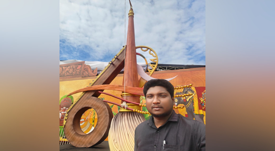ഇരിങ്ങാലക്കുട സ്വദേശിയും കാലടി ശ്രീ ശങ്കരാചാര്യ സംസ്കൃത സർവകലാശാലയിലെ ശില്പകല അധ്യാപകനുമായ എന് ആര് യദു കൃഷ്ണനാണ് കൊടിമരം രൂപകല്പന ചെയ്തത്. അദ്ദേഹത്തിനൊപ്പം ആറു പേര് 25 ദിവസത്തോളം അദ്ധ്വാനിച്ചാണ് കൊടിമരം യഥാര്ത്ഥ്യമാക്കിയത്. സംഗീതത്തിന്റെ ലൈനുകൾ കൈകൾ ആയി മാറുകയും അതിന്റെ അവസാനത്തിൽ ഒരു ചിലങ്കയുടെ സ്വഭാവം കൈവരുകയുമാണ് ശില്പ കൊടിമരത്തില്. അതിൽ 64 കലകളെ സൂചിപ്പിക്കുന്ന 64 ചിലങ്ക മണികൾ ഉണ്ട്. ബ്രഷിനു മുകൾവശത്തായി നെറ്റിപ്പട്ടം കെട്ടിയ ആനയുടെ ഒരു അമൂർത്ത രൂപവുമുണ്ട്. ആനയുടെ തുമ്പിക്കൈ താഴോട്ടിറങ്ങി വരുമ്പോൾ അതിന് സംഗീതത്തിലെ ട്രബിൾ ക്ലിഫ് എന്ന മ്യൂസിക് സിമ്പലായി രൂപമാറ്റം സംഭവിക്കുന്നു. സംഗീതം ഉച്ചസ്ഥായിയിൽ വായിക്കുമ്പോഴോ, ആലപിക്കുമ്പോഴോ ഉപയോഗിക്കുന്ന സിംബൽ ആണ് ട്രബിൾ ക്ലിഫ്. ചെണ്ട മേളം, വെടിക്കെട്ട് തുടങ്ങി എല്ലാത്തിന്റെയും ഉച്ചസ്ഥായിയായ ഒരു നാടിനെ ഇതിലൂടെ ദൃശ്യവത്കരിക്കാനുള്ള ശ്രമമാണ് യദു കൃഷ്ണന്റേത്.