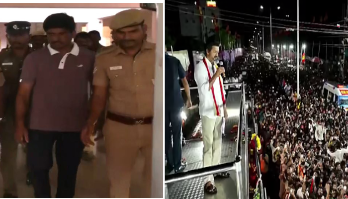കരൂർ ആൾക്കൂട്ട ദുരന്തത്തിൽ തമിഴക വെട്രി കഴകം നേതാക്കളായ മതിയഴകൻ, പൗൻ രാജ് എന്നിവരെ അറസ്റ്റ് ചെയ്ത് പൊലീസ്. ഇവരെ റിമാൻഡ് ചെയ്തു. കരൂർ ജുഡീഷ്യൽ മജിസ്ട്രേറ്റ് കോടതിയാണ് ഇവരെ റിമാൻഡ് ചെയ്തത്. ഒക്ടോബർ 14 വരെയാണ് റിമാന്ഡ് കാലാവധി. തമിഴക വെട്രി കഴകം കരൂർ വെസ്റ്റ് ജില്ലാ സെക്രട്ടറിയാണ് മതിയഴകന്. കരൂർ സെൻട്രൽ സിറ്റി സെക്രട്ടറിയാണ് പൗൻരാജ്.