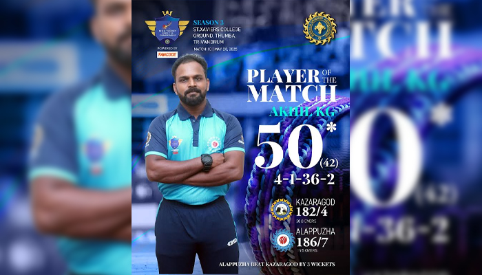രണ്ടാം മല്സരത്തിൽ അവസാന ഓവർ വരെ നീണ്ട ആവേശപ്പോരാട്ടത്തിലായിരുന്നു ആലപ്പുഴയുടെ വിജയം. കാസർഗോഡ് ഉയർത്തിയ 183 റൺസ് വിജയലക്ഷ്യം ഒരു പന്ത് ബാക്കി നില്ക്കെയാണ് ആലപ്പുഴ മറികടന്നത്. ആദ്യം ബാറ്റ് ചെയ്ത കാസർഗോഡ് 20 ഓവറിൽ നാല് വിക്കറ്റ് നഷ്ടത്തിൽ 182 റൺസെടുത്തു.സ്കോർ 27ൽ നില്ക്കെ മൂന്ന് വിക്കറ്റുകൾ നഷ്ടമായി തകർച്ചയെ നേരിട്ട കാസർഗോഡിനെ അൻഫലും മൊഹമ്മദ് കൈഫും ചേർന്ന 126 റൺസ് കൂട്ടുകെട്ടാണ് മികച്ച സ്കോറിലെത്തിച്ചത്. അൻഫൽ 47 പന്തുകളിൽ നിന്ന് 80ഉം മൊഹമ്മദ് കൈഫ് 38 പന്തുകളിൽ നിന്ന് 51ഉം റൺസെടുത്തു.അവസാന ഓവറുകളിൽ എട്ട് പന്തുകളിൽ നിന്ന് 20 റൺസുമായി പുറത്താകാതെ നിന്ന തുഷാറിൻ്റെ പ്രകടനവും ശ്രദ്ധേയമായി. ആലപ്പുഴയ്ക്ക് വേണ്ടി കെ ജി അഖിൽ രണ്ട് വിക്കറ്റ് വീഴ്ത്തി. മറുപടി ബാറ്റിങ്ങിന് ഇറങ്ങിയ ആലപ്പുഴയ്ക്ക് ഓപ്പണർമാരായ വിഷ്ണുരാജും ആകാശ് പിള്ളയും ചേർന്ന് അതിവേഗത്തിലുള്ള തുടക്കം നല്കി. വിഷ്ണുരാജ് 16 പന്തുകളിൽ 40 റൺസും ആകാശ് പിള്ള ഒൻപത് പന്തുകളിൽ നിന്ന് 29 റൺസും നേടി. ഇരുവരും വൈകാതെ പുറത്തായെങ്കിലും അഭിഷേക് നായരുടെയും കെ ജി അഖിലിൻ്റെയും മികച്ച ഇന്നിങ്സുകൾ ആലപ്പുഴയ്ക്ക് വിജയമൊരുക്കി. അഭിഷേക് 18 പന്തുകളിൽ നിന്ന് 31 റൺസെടുത്തപ്പോൾ അഖിൽ 50 റൺസുമായി പുറത്താകാതെ നിന്നു. കാസർഗോഡിന് വേണ്ടി മൊഹമ്മദ് ജസ്ലീലും അബ്ദുൾ ഫാഹിസും രണ്ട് വിക്കറ്റ് വീതം വീഴ്ത്തി. ബാറ്റിങ്ങിലും ബൌളിങ്ങിലും തിളങ്ങിയ അഖിലാണ് കളിയിലെ താരം.