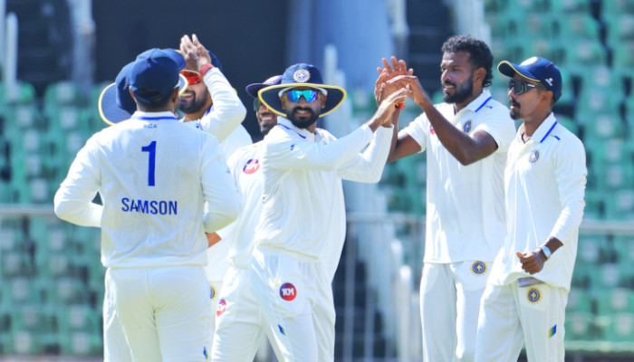 49 റൺസെടുത്ത ജലജ് സക്സേനയെ പുറത്താക്കി നിധീഷ് തന്നെയാണ് ഈ കൂട്ടുകെട്ടിനും അവസാനമിട്ടത്. നിധീഷിന്റെ പന്തിൽ ജലജ് എൽബിഡബ്ല്യുവിൽ കുടുങ്ങുകയായിരുന്നു. വൈകാതെ സെഞ്ചുറിക്കരികെ ഋതുരാജ് ഗെയ്ക്വാദും മടങ്ങി. 91 റൺസെടുത്ത ഗെയ്ക്വാദിനെ ഏദൻ ആപ്പിൾ ടോമാണ് എൽബിഡബ്ല്യുവിലൂടെ പുറത്താക്കിയത്. 151 പന്തുകളിൽ 11 ഫോറുകൾ അടങ്ങുന്നതായിരുന്നു ഗെയ്ക്വാദിന്റെ ഇന്നിങ്സ്. കേരളത്തിന് വേണ്ടി നിധീഷ് നാലും ബേസിൽ രണ്ടും ഏദൻ ആപ്പിൾ ടോം ഒരു വിക്കറ്റും വീഴ്ത്തി.