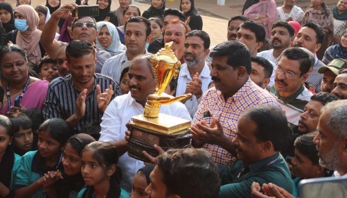 64-ാമത് കേരള സ്കൂൾ കലോത്സവ വിജയികള്‍ക്ക് സമ്മാനിക്കുന്ന സ്വർണക്കപ്പിന്റെ ഘോഷയാത്ര കാസർകോട് മൊഗ്രാലിൽ എകെഎം അഷ്റഫ് എംഎൽഎ ഫ്ലാഗ് ഓഫ് ചെയ്തു. ജില്ലാ പഞ്ചായത്ത് പ്രസിഡന്റ് സാബു എബ്രഹാം അധ്യക്ഷത വഹിച്ചു. കുമ്പള ഗ്രാമപഞ്ചായത്ത് പ്രസിഡന്റ് വി പി അബ്ദുൽ ഖാദർ, വൈസ് പ്രസിഡന്റ് ബിൽഖീസ്, ജില്ലാ പഞ്ചായത്തംഗം അസീസ് കളത്തൂർ, ഡിഡിഇ ഇൻ ചാർജ് സത്യഭാമ, വിഎച്ച്എസ് സി അസി. ഡയറക്ടർ ഉദയകുമാരി, കാസർകോട് ഡിഇഒ അനിത, പ്രിൻസിപ്പൽ വി എസ് ബിനി, ഹെഡ് മാസ്റ്റർ ജെ ജയറാം, വാർഡ് മെമ്പർ ജമീല ഹസൻ, പിടിഎ പ്രസിഡന്റ് ലത്തീഫ് കൊപ്പളം, ജാഥാ ക്യാപ്റ്റൻ ഗിരീഷ് ചോലയിൽ തുടങ്ങിയവർ പ്രസംഗിച്ചു.