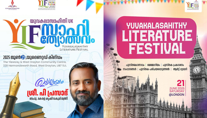 കഴിഞ്ഞ അഞ്ചു പതിറ്റാണ്ടായി കലാ — സാഹിത്യ‑സാമൂഹ്യ‑സാംസ്കാരിക- രാഷ്ട്രീയ മേഖലയിൽ സജീവ ഇടപെടലുകൾ നടത്തുന്ന യുവകലാസാഹിതി യു കെയുടെ നേതൃത്വത്തിൽ സംഘടിപ്പിക്കുന്ന സാഹിത്യോത്സവത്തിന് ലണ്ടൻ വേദിയാവുകയാണ്. യൂറോപ്പിലെ പ്രഥമ മലയാള സാഹിത്യോത്സവമായ യുവകലാസാഹിതി സാഹിത്യോത്സവം (വൈ.എൽ.എഫ്)ന്റെ ആദ്യ പതിപ്പിന് ലണ്ടനിലെ വെസ്റ്റ് ഡ്രൈറ്റൻ കമ്മ്യൂണിറ്റി ഹാളിൽ 2025 ജൂൺ 21ന് രാവിലെ തിരിതെളിയും.