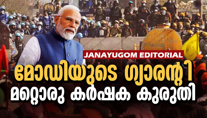 ‘മോഡിയുടെ ഗ്യാരന്റി‘യുടെ ബലിപീഠത്തിൽ ഒരു കർഷകൻ കൂടി കുരുതിയായി. കർഷകരുടെ ഉല്പന്നങ്ങൾക്ക് നിയമത്തിന്റെ പിൻബലമുള്ള കുറഞ്ഞ താങ്ങുവില എന്നത് പ്രധാനമന്ത്രി നരേന്ദ്ര മോഡിയും ബിജെപിയും 2014ലെ തെരഞ്ഞെടുപ്പ് പ്രകടനപത്രികയിൽ കർഷകർക്ക് നൽകിയ ഗ്യാരന്റിയാണ്. അധികാരത്തിൽ 10വർഷം പൂർത്തിയാക്കുമ്പോഴും ആ വാഗ്ദാനം, ഗ്യാരന്റി, മറ്റ് പല ഗ്യാരന്റിയെയും പോലെ ഇനിയും പാലിക്കപ്പെട്ടിട്ടില്ല. 2021–22 കാലയളവിൽ ഡൽഹി നഗരത്തെ ഉപരോധിച്ച് നടത്തിയ ഐതിഹാസിക സമരത്തിൽനിന്നും അവരെ പിന്തിരിപ്പിക്കാൻ പ്രധാനമന്ത്രി തന്റെ ഗ്യാരന്റി കർഷകരോടും രാജ്യത്തോടും ആവർത്തിക്കുകയുണ്ടായി. 750ല്പരം പേരെ ആ പ്രക്ഷോഭത്തിൽ ബലിനൽകിയ കർഷകർ പ്രധാനമന്ത്രിയുടെ വാക്കുകൾ വിശ്വസിച്ച് സമരമുഖത്തുനിന്നും പിന്മാറി. മോഡിയുടെ ഗ്യാരന്റിയിൽ വിശ്വസിച്ച തങ്ങള് വഞ്ചിക്കപ്പെട്ടു എന്ന് തിരിച്ചറിഞ്ഞപ്പോഴാണ് താങ്ങുവിലയടക്കം ആവശ്യങ്ങൾ ഉന്നയിച്ച് ഡൽഹിയിലേക്ക് വീണ്ടും മാർച്ചുചെയ്യാൻ കർഷകർ തയ്യാറായത്. ശത്രുക്കളെയെന്നപോലെ ഹരിയാനയുടെയും ഡൽഹിയുടെയും അതിർത്തികളിൽ വൻ പ്രതിരോധമുയർത്തിയാണ് കർഷകരെ നേരിടാൻ കേന്ദ്ര, സംസ്ഥാന ബിജെപി സർക്കാരുകൾ മുതിർന്നത്. കർഷകരെ പ്രക്ഷോഭത്തിൽനിന്നും പിന്തിരിപ്പിക്കാൻ അഞ്ചുതവണ കേന്ദ്രമന്ത്രിമാരുടെ നേതൃത്വത്തിൽ അനുരഞ്ജന ചർച്ചകൾ നടന്നു. നെല്ല്, ഗോതമ്പ് എന്നിവയ്ക്ക് പുറമെ മൂന്നുതരം പയർ-പരിപ്പിനങ്ങൾ, ചോളം, പരുത്തി എന്നിവയ്ക്ക് കരാർകൃഷി അടിസ്ഥാനത്തിൽ അടുത്ത അഞ്ചുവർഷത്തേക്ക് താങ്ങുവില നല്കാമെന്ന വാഗ്ദാനത്തിന് അപ്പുറത്തേക്ക് കർഷകരുടെ ആവശ്യങ്ങളോട് നിഷേധാത്മക സമീപനമാണ് കേന്ദ്രം സ്വീകരിച്ചത്. രോഷാകുലരായ കർഷകർ ഡൽഹിയിലേക്കുള്ള മാർഗമധ്യേ ഹരിയാന അതിർത്തികളിൽ തടയപ്പെട്ടു. 1,200ല്പരം ട്രാക്ടർ ട്രോളികളിലായി എത്തിയ 14,000ത്തില്പരം കർഷകരാണ് പഞ്ചാബ്, ഹരിയാന അതിർത്തിയിലെ ശംബുവിൽമാത്രം തടയപ്പെട്ടിട്ടുള്ളത്. അവർക്കുനേരെ തുടർന്നുവരുന്ന ഡ്രോണുകളും റബ്ബർ ബുള്ളറ്റുകളും ഉപയോഗിച്ചുള്ള ആക്രമണത്തില് ഇന്നലെ ഒരു യുവകർഷകൻ കൊല്ലപ്പെടുകയും അനേകംപേർക്ക് ഗുരുതരമായി പരിക്കേൽക്കുകയുമുണ്ടായത്.