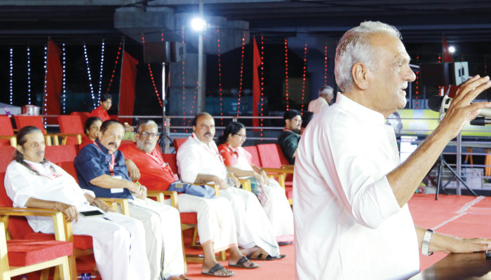 അഡാനിയെയും അംബാനിയെയുമെല്ലാം പ്രീതിപ്പെടുത്തുന്ന മോഡി സർക്കാർ രാജ്യത്ത് ഭയക്കുന്നത് കമ്മ്യൂണിസ്റ്റുകാരെയും നക്സലൈറ്റുകളെയുമാണ്. അതിനാൽ അവർ കമ്മ്യൂണിസ്റ്റുകാരെയും നക്സലൈറ്റുകളായി താരതമ്യപ്പെടുത്തി ദേശവിരുദ്ധരായി പ്രചരിപ്പിക്കുകയാണെന്നും അദ്ദേഹം പറഞ്ഞു. ഫാസിസ്റ്റ് ഭരണകൂടത്തിനെതിരെ യോജിച്ച പോരാട്ടത്തിന് കമ്മ്യൂണിസ്റ്റുകാർ മുന്നോട്ട് വരണമെന്നും അദ്ദേഹം ആഹ്വാനം ചെയ്തു.