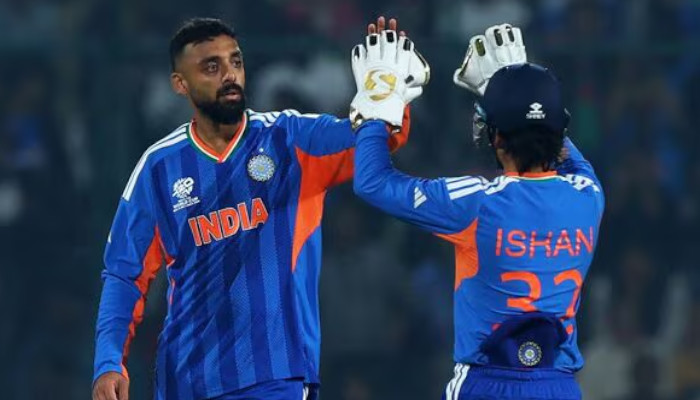 അസുഖബാധിതനായ അഭിഷേക് ശർമ്മയ്ക്ക് പകരം ടീമിലെത്തിയ സഞ്ജു സാംസൺ തുടക്കം മുതൽ ആക്രമിച്ച് കളിച്ചു. ടി20 ലോകകപ്പ് അരങ്ങേറ്റ മത്സരത്തില് എട്ട് പന്തിൽ നിന്ന് മൂന്ന് സിക്സും ഒരു ഫോറും സഹിതം 22 റൺസ് നേടി സഞ്ജു പുറത്തായി. എന്നാല് ഇന്ത്യയുടെ സ്കോറിങ് വേഗത കുറഞ്ഞില്ല. സഞ്ജു മടങ്ങിയതിന് പിന്നാലെ ഇഷാന് കിഷന് തകര്ത്തടിച്ചതോടെ പവര്പ്ലേയില് ഒരു വിക്കറ്റ് നഷ്ടത്തില് 86 റണ്സാണ് അടിച്ചുകൂട്ടിയത്. ഇഷാൻ കിഷൻ 24 പന്തിൽ നിന്ന് 61 റൺസ് നേടിയാണ് പുറത്തായത്. ജെ ജെ സ്മിത്ത് എറിഞ്ഞ ആറാം ഓവറിൽ നാല് സിക്സറുകളും ഒരു ഫോറും ഉൾപ്പെടെയാണ് ഇഷാൻ സ്കോർ ഉയർത്തിയത്. ഒടുവിൽ നമീബിയൻ ക്യാപ്റ്റൻ ഇറാസ്മസ് ഇഷാനെ പുറത്താക്കി. ഇഷാനും തിലക് വര്മ്മയും ചേര്ന്ന് 79 റണ്സാണ് കൂട്ടിച്ചേര്ത്തത്.
