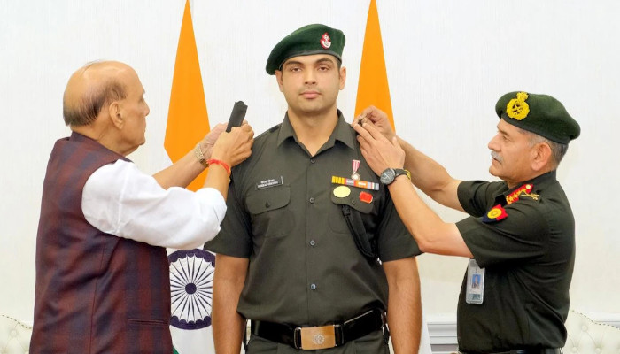 ഒളിമ്പിക്സ് സ്വർണ മെഡൽ ജേതാവ് നീരജ് ചോപ്രയെ ഇന്ത്യൻ ആർമിയിൽ ഓണററി ലെഫ്റ്റനന്റ് കേണൽ പദവി നൽകി ആദരിച്ചു. കായികമേഖലയിൽ രാജ്യത്തിന് നൽകിയ സംഭാവനകൾ പരിഗണിച്ചാണ് ടെറിട്ടോറിയൽ ആർമിയിൽ താരത്തിന് ഈ ബഹുമതി നൽകിയത്. ഏപ്രിൽ 16 മുതലാണ് നിയമനം പ്രാബല്യത്തിൽ വന്നത്. ഡൽഹിയിൽ നടന്ന ചടങ്ങിൽ പ്രതിരോധ മന്ത്രി രാജ്നാഥ് സിങ്, കരസേനാ മേധാവി ജനറൽ ഉപേന്ദ്ര ദ്വിവേദി എന്നിവർ ചേർന്നാണ് നീരജ് ചോപ്രയ്ക്ക് പദവി കൈമാറിയത്.