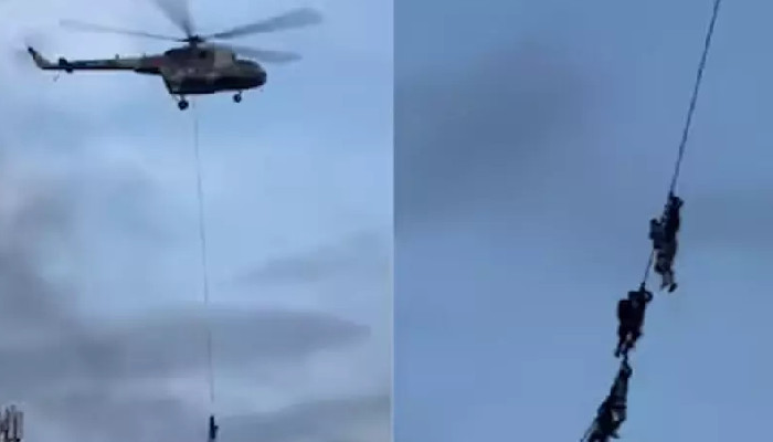നേപ്പാൾ മന്ത്രിയും കുടുംബവും ഹെലികോപ്ടറിൽ രക്ഷപ്പെട്ട് ദൃശ്യങ്ങൾ പുറത്ത്. ഹോട്ടലിൽ നിന്നും ഹെലികോപ്ടറിൽ തൂങ്ങി ഇവർ രക്ഷപ്പെടുന്നതിന്റെ വിഡിയോ ദൃശ്യങ്ങളാണ് പുറത്തുവിട്ടത്. സംഭവത്തിന്റെ ടിക് ടോക് വിഡിയോ എക്സിലാണ് പ്രത്യക്ഷപ്പെട്ടത്. നേപ്പാളിലെ കലാപം മൂന്ന് ദിവസമായി തുടരുകയാണ്. സംഘർഷത്തിനിടെ നേപ്പാളിലെ മന്ത്രിമാർക്ക് ഉൾപ്പടെ മർദനമേൽക്കുന്ന സാഹചര്യമുണ്ടായിരുന്നു. നിരവധി മന്ത്രിമാരുടെ വസതികൾ പ്രക്ഷോഭകാരികൾ അഗ്നിക്കിരയാക്കുകയും ചെയ്തു. നേപ്പാളിൽ ആളിപ്പടർന്ന ജെൻ സി പ്രക്ഷോഭത്തിനിടെ പ്രതിഷേധക്കാർ പാർലമെന്റ് മന്ദിരം അഗ്നിക്കിരയാക്കി. പ്രധാനമന്ത്രി കെ പി ശർമ ഒലി പദവി രാജിവെക്കുന്നതിന് മിനിറ്റുകൾക്കു മുമ്പാണ് പാർലമെന്റിലേക്ക് അതിക്രമിച്ചു കയറിയ പ്രതിഷേധക്കാർ കെട്ടിടത്തിന് തീയിട്ടത്. ഭക്ത്പുരിലുള്ള പ്രധാനമന്ത്രിയുടെയും മുതിർന്ന നേതാക്കളുടെയും വസതികളും പ്രതിഷേധത്തീയിൽ വെണ്ണീറായി. പാർലമെന്റിലേക്ക് പ്രക്ഷോഭകർ ഇരച്ചുകയറുന്നതിന്റേയും കെട്ടിടത്തിൽനിന്ന് പുക ഉയരുന്നതിന്റെയും ദൃശ്യങ്ങൾ സമൂഹമാധ്യമങ്ങളിൽ വ്യാപകമായി പ്രചരിക്കുന്നുണ്ട്.