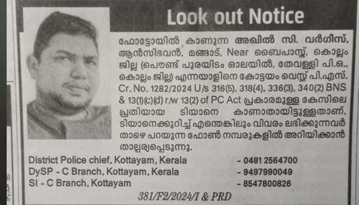 കോട്ടയം നഗരസഭയിലെ മൂന്നു കോടിയുടെ പെൻഷൻ ഫണ്ട് തട്ടിപ്പ് കേസിലെ പ്രതി അഖിൽ വർഗീസിനെ കണ്ടെത്താൻ ലുക്ക് ഔട്ട് നോട്ടീസ് പുറപ്പെടുവിച്ചു