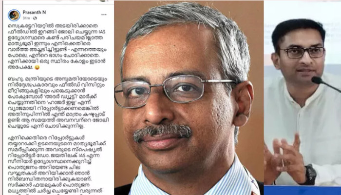സംസ്ഥാനത്തെ ഐഎഎസ് തലപ്പത്ത് പൊരിഞ്ഞ പോര്. എ ജയതിലകിന്റെ ചിത്രം സഹിതം ഫേസ്ബുക്കിൽ കുറിപ്പിട്ട എൻ പ്രശാന്ത് അതിരൂക്ഷ വിമർശനമാണ് ഉന്നയിച്ചത്. തനിക്കെതിരെ മാധ്യമങ്ങൾക്ക് വാർത്ത നൽകുന്നത് ജയതിലകാണെന്ന് ആരോപിച്ച പ്രശാന്ത്, ‘സ്പെഷൽ റിപ്പോർട്ടർ’ എന്നാണ് ജയതിലകിനെ വിമർശിച്ചത്.