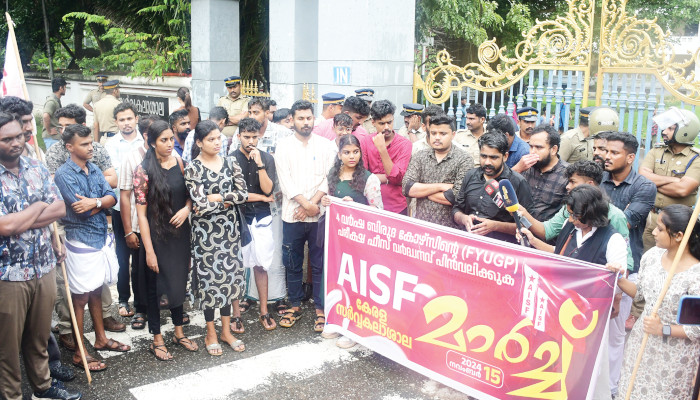 കേരള- കാലിക്കറ്റ് സർവകലാശാലകളുടെ നാലുവർഷ ബിരുദ കോഴ്സുകളിലേക്കുള്ള പരീക്ഷാഫീസ് വർധിപ്പിച്ച നടപടി കേരളത്തിലെ വിദ്യാർത്ഥികൾക്ക് നേരെയുള്ള വെല്ലുവിളിയാണെന്ന് മാർച്ച് ഉദ്ഘാടനം ചെയ്ത് എഐഎസ്എഫ് സംസ്ഥാന പ്രസിഡന്റ് ആർ എസ് രാഹുൽ രാജ് പറഞ്ഞു. കഴിഞ്ഞ വർഷത്തേക്കാൾ മൂന്നു ഇരട്ടിയോളം വർധനവാണ് ഇപ്പോഴത്തെ ഫീസ് നിരക്കിൽ ഉണ്ടായിരിക്കുന്നത്. പുതിയ സിലബസിന് അനുസൃതമായി താല്പര്യപൂർവ്വം നാലുവർഷ ബിരുദത്തിലേക്ക് പ്രവേശിച്ച വിദ്യാർത്ഥികളെ വെല്ലുവിളിക്കുന്ന തരത്തിലാണ് ഈ ഫീസ് വർധനവ്.