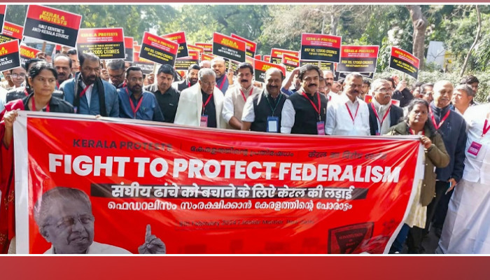 കേന്ദ്രത്തിനെതിരായ കേരള സര്‍ക്കാരിന്റെ പ്രതിഷേധം കേരള ഹൗസില്‍ നിന്നും ആരംഭിച്ച മാര്‍ച്ച് ജന്തര്‍ മന്തറില്‍ എത്തി.മുഖ്യമന്ത്രിയും മന്ത്രിമാരും പ്രതിഷേധ പ്ലക്കാര്‍ഡുമായാണ് മാര്‍ച്ചില്‍ അണിനിരന്നത്. കേരള ഹൗസില്‍ നിന്നും മുഖ്യമന്ത്രിയുള്‍പ്പെടെയുള്ള മന്ത്രിമാര്‍ നടന്നാണ് ജന്തര്‍മന്തറിലേക്ക് എത്തിയത്.രാജ്യം ഇന്നുവരെ കണ്ടിട്ടില്ലാത്ത ഒരു പ്രതിഷേധത്തിന് സാക്ഷിയാകുകയാണ് ജന്തര്‍ മന്തര്‍.