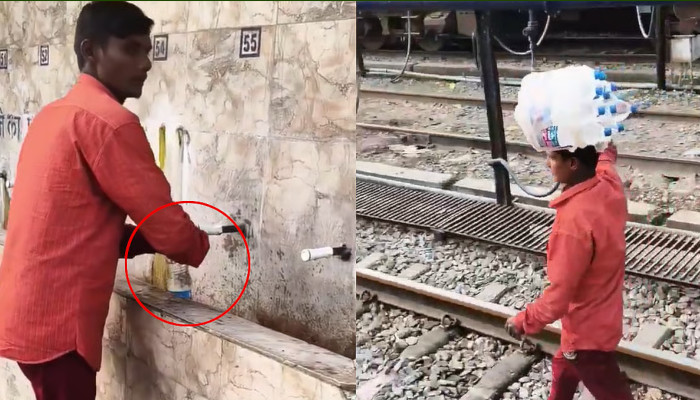 റെയില്വേ സ്റ്റേഷനിലെ പൊതു ടാപ്പില് നിന്ന് കുപ്പികളില് വെള്ളം നിറച്ച് യാത്രക്കാര്ക്ക് വില്ക്കുന്നയാളുടെ വീഡിയോ സമൂഹമാധ്യമത്തില് വൈറലാണ്. യുപിയിലെ പണ്ഡിറ്റ് ദീൻ ദയാൽ ഉപാധ്യായ ജംഗ്ഷനിലാണ് സംഭവം നടന്നത്. മലിനമായ സാഹചര്യത്തിലാണ് ഇയാഴ് കുപ്പികളില് വെള്ളം നിറക്കുന്നത്. വീഡിയോ ചിത്രീകരിക്കുന്നത് കണ്ടതോടെ ഇയാൾ പെട്ടെന്ന് വെള്ളം നിറച്ച മറ്റ് കുപ്പികളുമെടുത്ത് പ്ലാറ്റ്ഫോമില് നിന്നും മറ്റൊരു പ്ലാറ്റ്ഫോമിലേക്ക് പോവുകയായിരുന്നു.