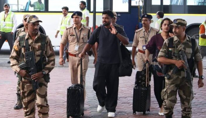 ഇന്നലെ ആണ് സഞ്ജു തലസ്ഥാനത്ത് എത്തിയത്. വിജയം നാട്ടുകാർക്ക് സമർപ്പിക്കുന്നുവെന്നായിരുന്നു വിമാനത്താവളത്തിൽ വച്ച് പ്രതികരിച്ചത്. അച്ഛനും അമ്മയ്ക്കും ഒപ്പം കുറച്ചുസമയം ചെലവഴിക്കാനാണ് ഉടൻ നാട്ടിലെത്തിയതെന്നും താരം പറഞ്ഞു. അപ്രതീക്ഷിതമായിട്ടായിരുന്നു സഞ്ജുവിന്റെ മടങ്ങിവരവ്. വിമാനത്താവളത്തിൽ മന്ത്രി വി. ശിവൻകുട്ടിയുടെ നേതൃത്വത്തിൽ സ്വീകരണം നൽകി. എ.എ. റഹിം എം.പി.യും മന്ത്രിക്കൊപ്പമുണ്ടായിരുന്നു.
